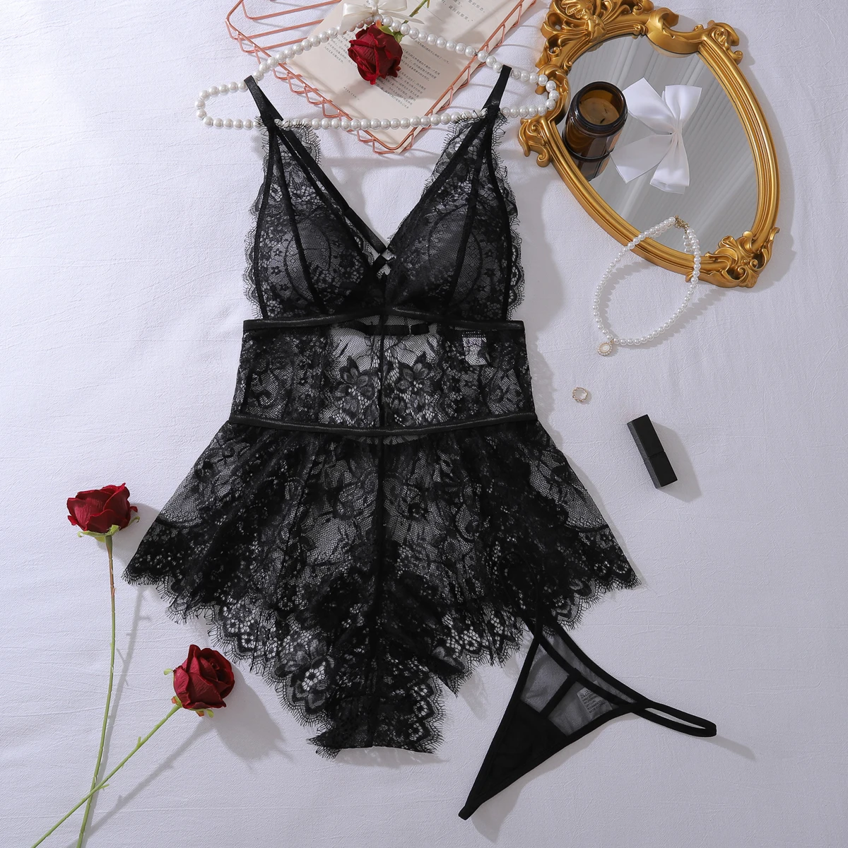 Strona Główna » Produkty » Bielizna Nocna » Body Damskie » Body koronkowe » Body koronkowe z rozkloszowanym dołem i stringami