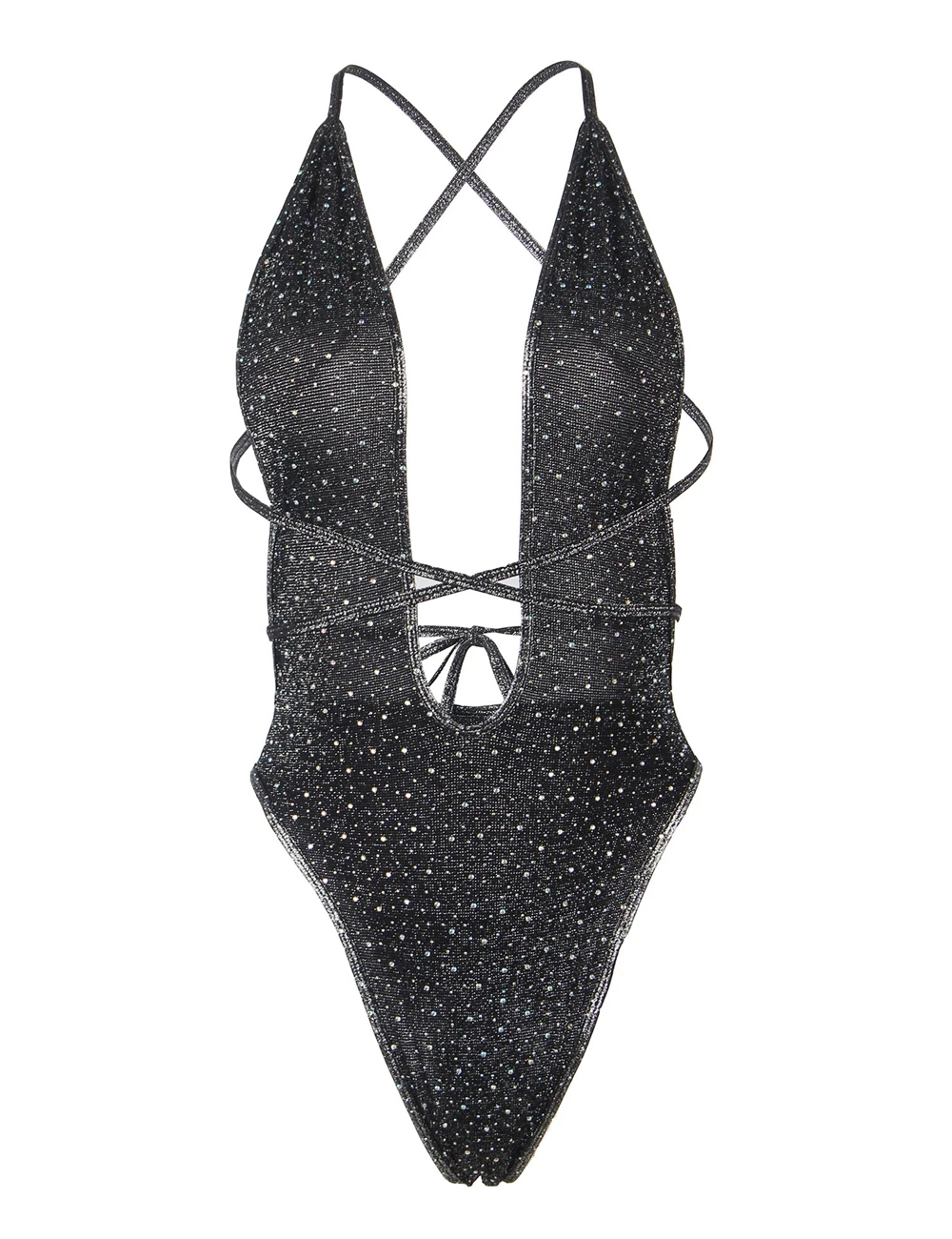 Jednoczęściowe body uszyte z elastycznej dzianiny o subtelnym połysku i drobnym, punktowym wzorze. Przód ma bardzo głęboki dekolt w kształcie litery V oraz krój typu halter oparty na cienkich ramiączkach. Boki są mocno wycięte, co porządkuje linię talii i bioder. Z tyłu ramiączka krzyżują się i łączą w wiązanie na wysokości środkowej części pleców. Dół jest wysoko podcięty, a krawędzie wykończone elastyczną lamówką dla stabilnego ułożenia.