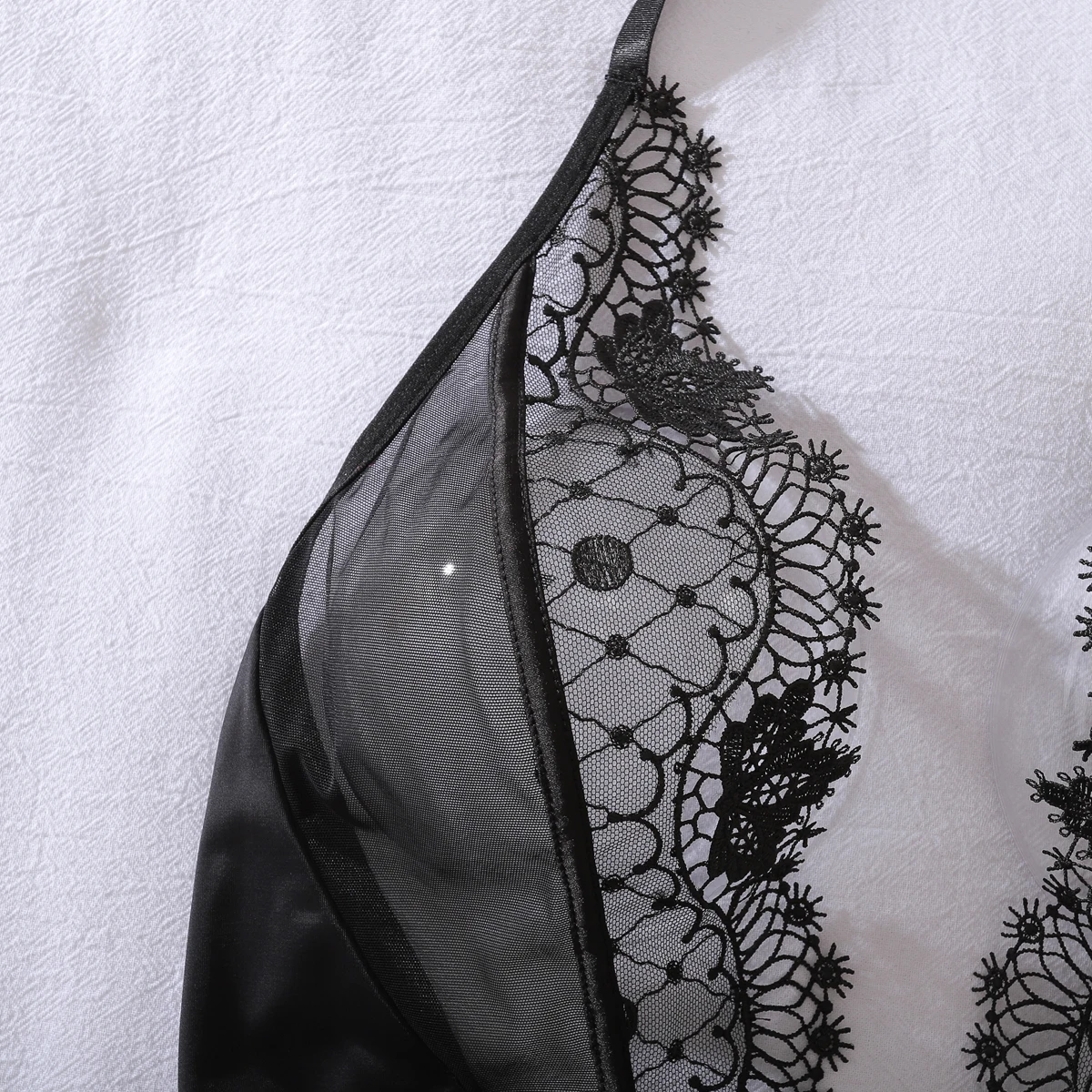 Sprawdzi się jako baza do domowych stylizacji oraz pod lekkie okrycia, gdzie liczy się gładka linia i lekka struktura materiału. Głęboki dekolt z koronkową krawędzią daje wyraźny, dekoracyjny rysunek, a pas w talii pomaga utrzymać estetyczne ułożenie całości. Odsłonięte plecy i układ halter porządkują ramiona, dzięki czemu model dobrze prezentuje się w kadrze. Elastyczna siateczka ułatwia dopasowanie i zapewnia swobodę ruchu podczas noszenia.