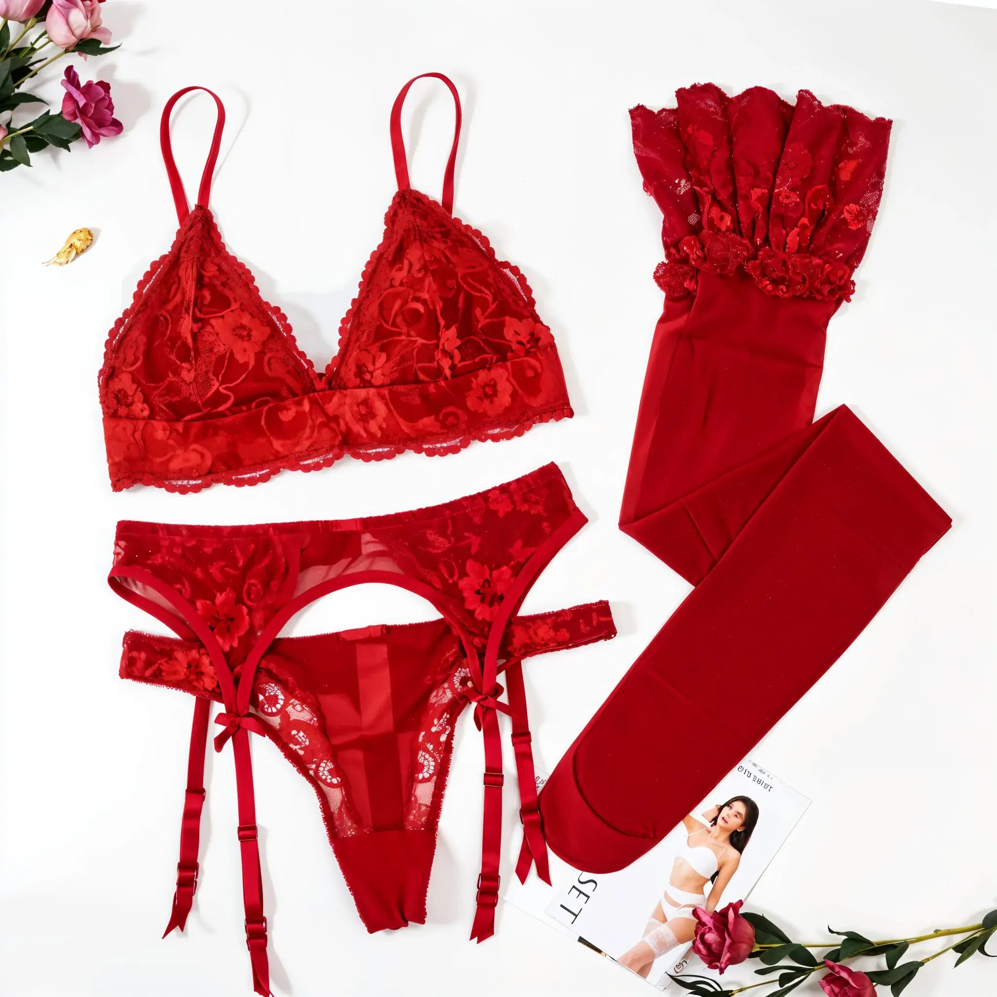 4 opinie dla Czteroczęściowy komplet bielizny koronkowej z pończochami