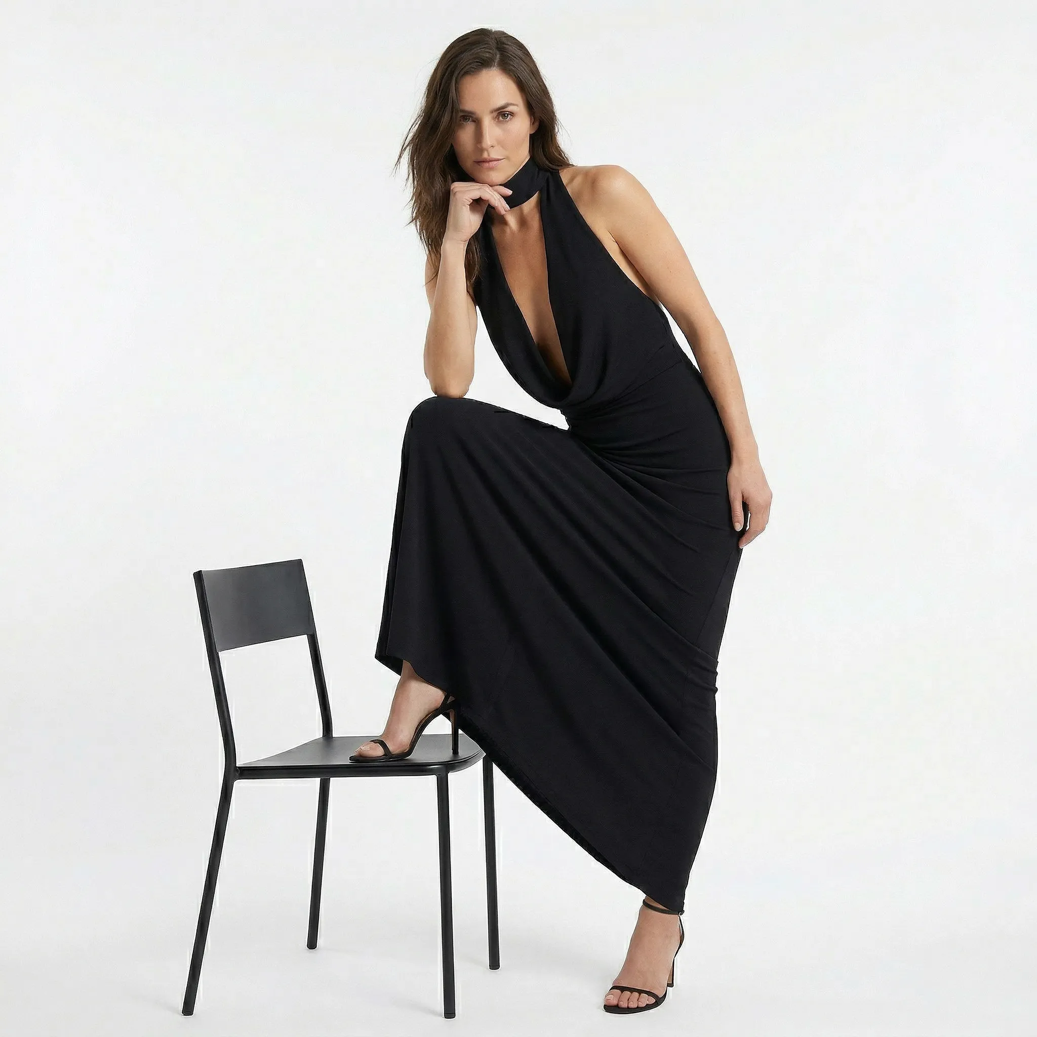 Długa suknia o wyraźnie zmysłowym kroju, która łączy w sobie drapieżny dekolt i wyrafinowaną linię. Głęboki, drapowany kaskadowy dekolt opada od chokerowego kołnierza, tworząc miękkie fałdy wokół biustu. Wysoki kołnierz w formie obroży kontrastuje z odsłoniętą górą, nadając projekowi teatralnego, a jednocześnie subtelnego charakteru.