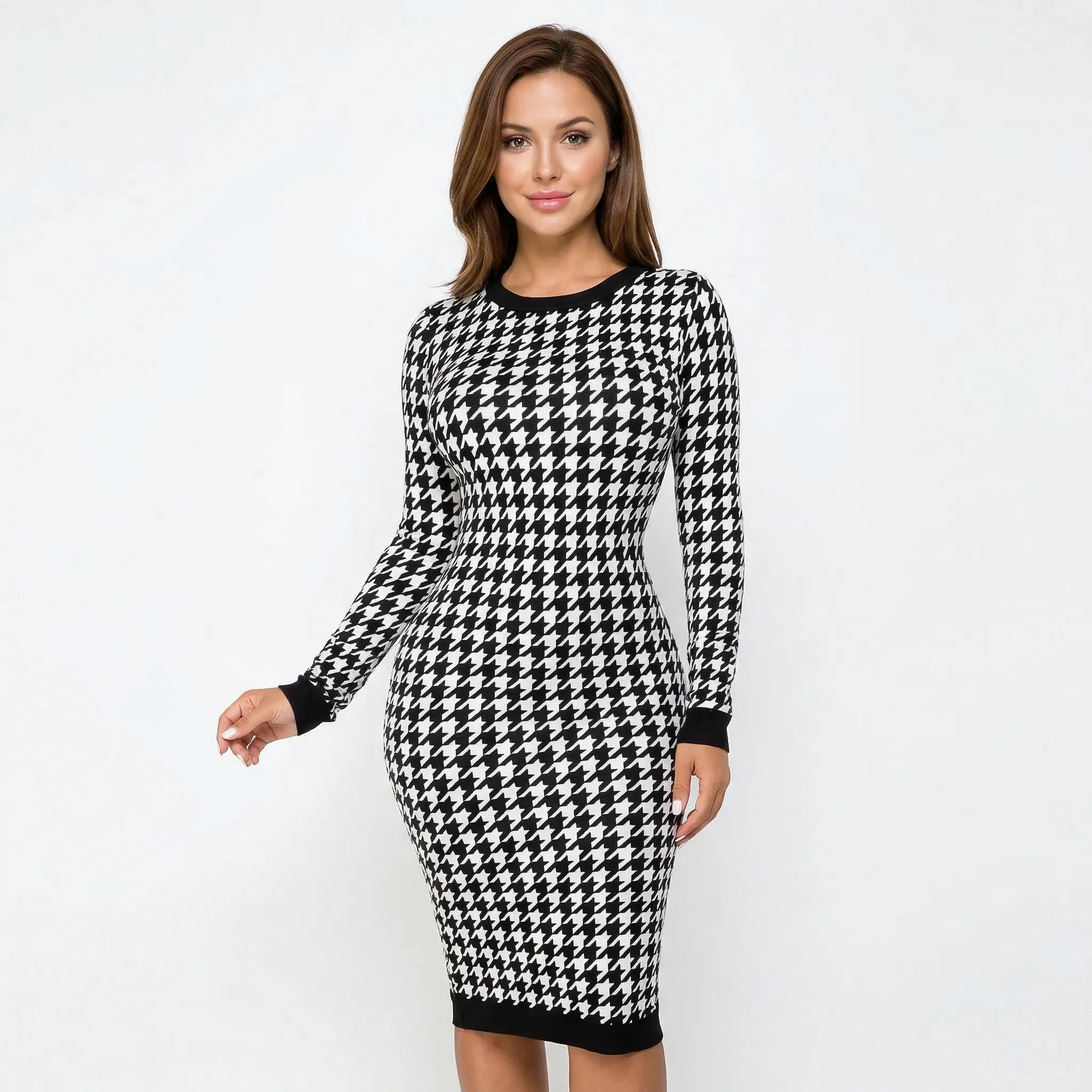 Dopasowana sukienka midi w pepitkę z długim rękawem