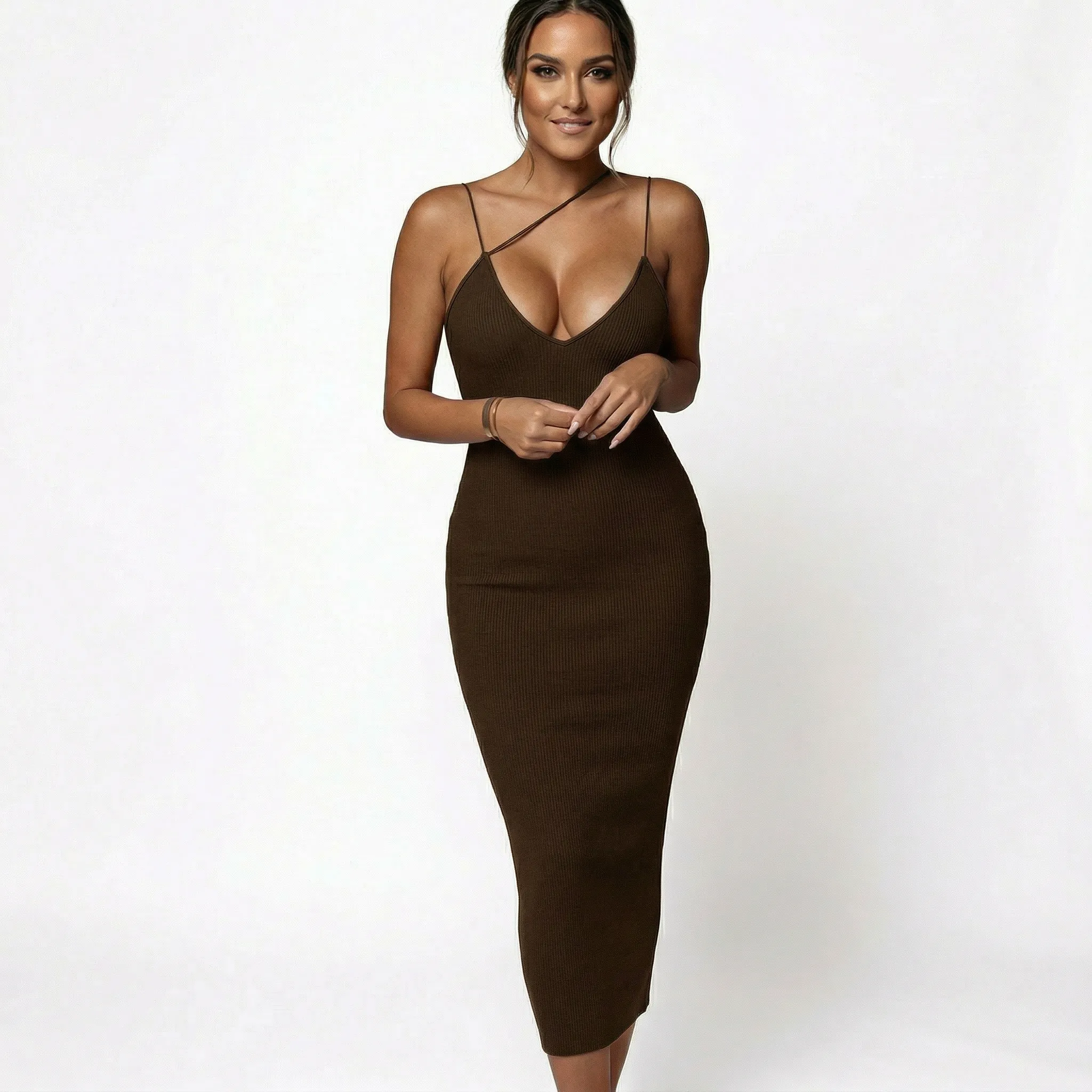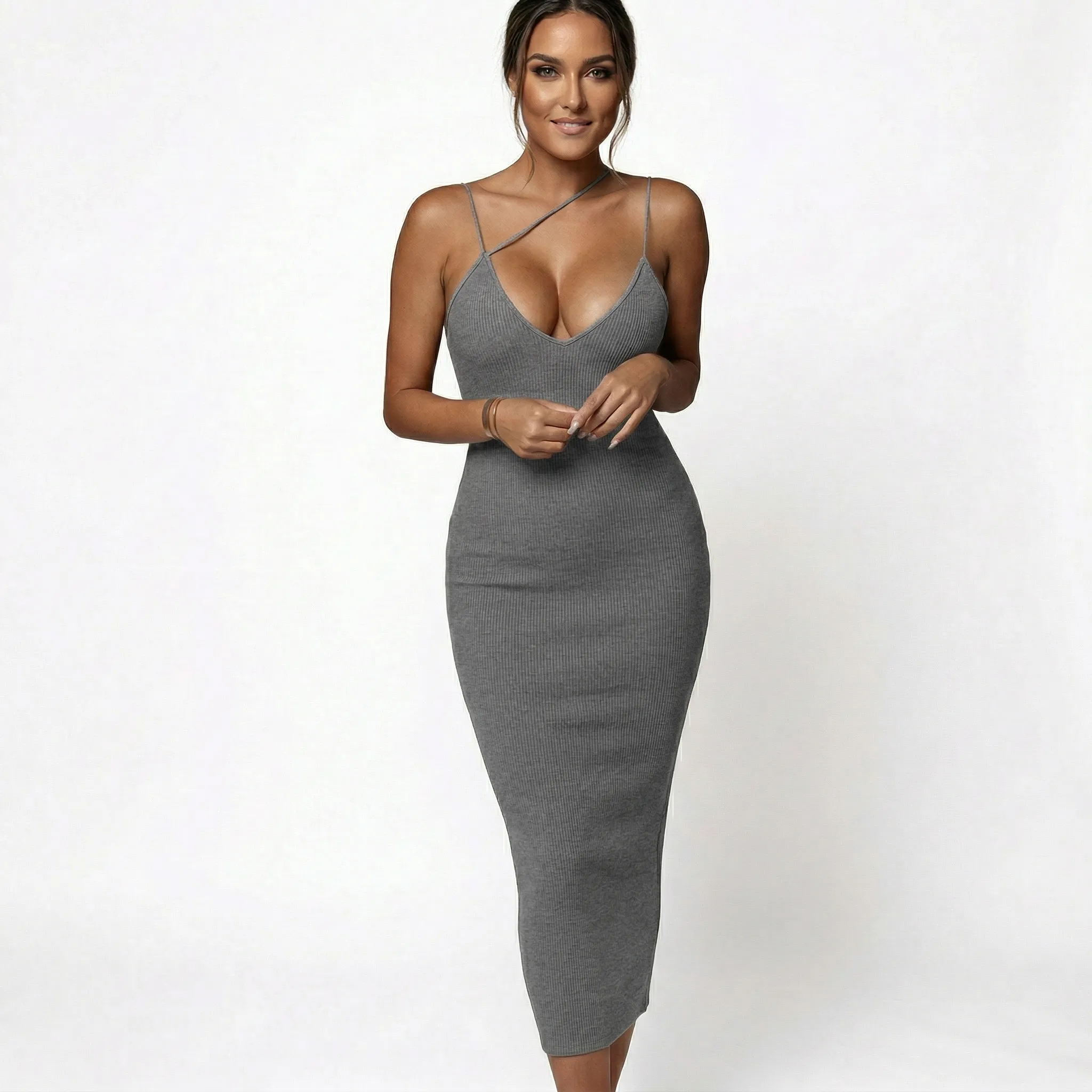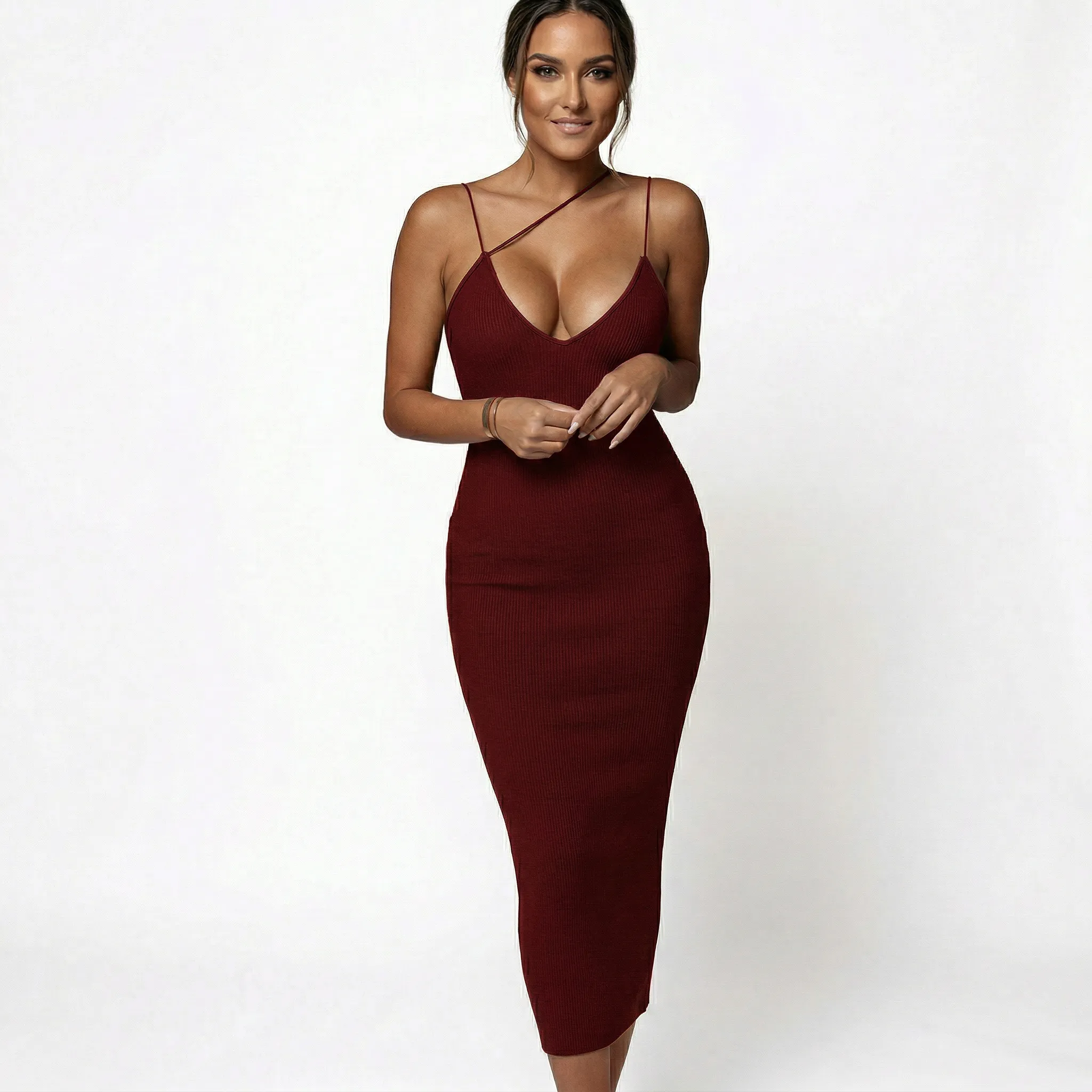Smukła sukienka o długości midi tworzy wyraźnie zmysłową sylwetkę. Głęboki dekolt w kształcie litery V eksponuje szyję i obojczyki, a cienkie, delikatne ramiączka dodają kreacji lekkości. Jedno z ramiączek układa się diagonalnie, tworząc subtelny asymetryczny akcent, który przełamuje klasyczną formę i przyciąga spojrzenie.