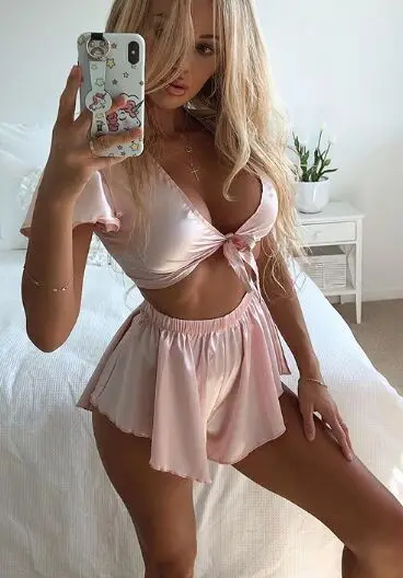 dwuczęściowy komplet, crop top, głęboki dekolt V, wiązanie z przodu, krótki rękaw, luźne krótkie spodenki, elastyczny pas, rozkloszowane nogawki, falbanka na dole, gładka tkanina, delikatny połysk