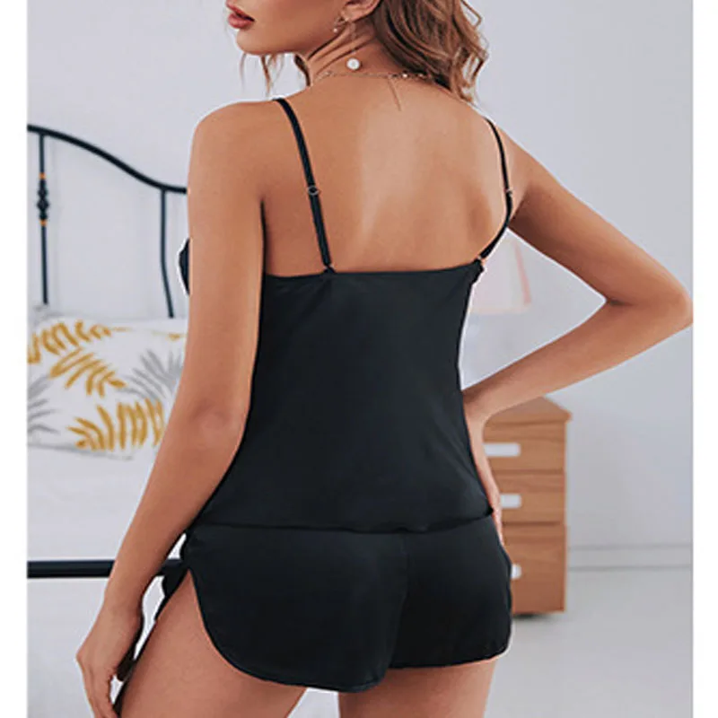 dwuczęściowy komplet, top na regulowanych ramiączkach, dekolt w kształcie litery V, luźny krój, krótkie szorty z elastycznym pasem, zaokrąglone wycięcia na nogawkach, delikatny połysk