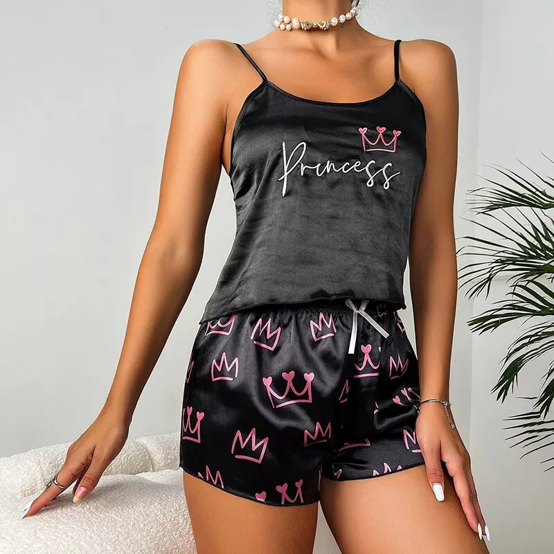Komplet składa się z koszulki na cienkich ramiączkach z okrągłym dekoltem oraz krótkich spodenek z elastyczną talią i ozdobnym sznurkiem. Koszulka posiada napis oraz motyw korony, natomiast spodenki zdobi powtarzający się wzór koron. Obie części mają luźny krój i delikatny połysk.