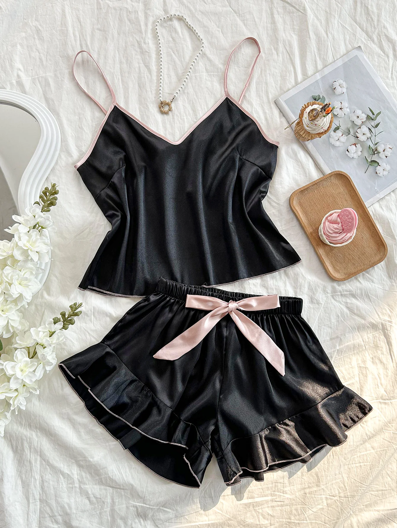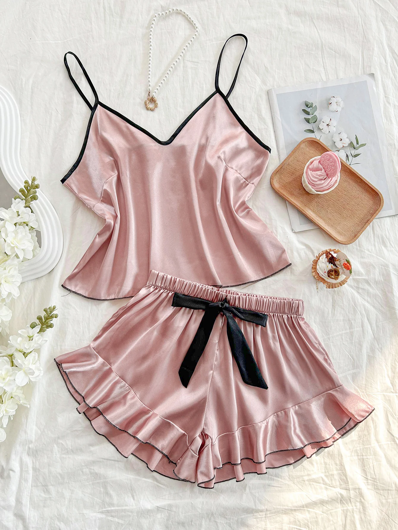 Komplet składa się z topu na cienkich ramiączkach z dekoltem w kształcie litery V oraz krótkich szortów z elastycznym pasem i ozdobną kokardą. Top wykończony jest kontrastową lamówką przy dekolcie i pachach. Szorty posiadają podwójne falbanki na nogawkach z kontrastowym obszyciem, co nadaje całości dekoracyjnego charakteru. Materiał ma gładką, lśniącą powierzchnię.
