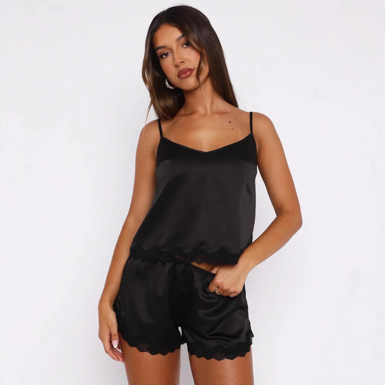 top na cienkich ramiączkach, dekolt w kształcie litery V, falista koronka na krawędziach, krótkie szorty o luźnym kroju, boczna kieszeń w szortach, gładka, lekko lśniąca powierzchnia materiału