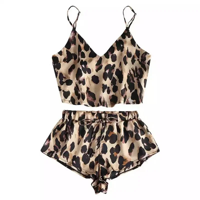 dwuczęściowy komplet, top na cienkich ramiączkach, dekolt w kształcie litery V, luźny krój, szorty z elastycznym pasem, ozdobne wiązanie w pasie, wzór panterki