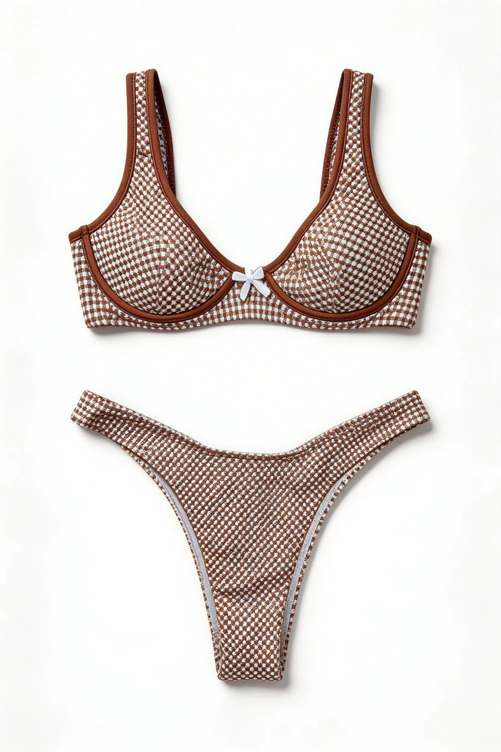 Dwuczęściowy kostium kąpielowy z kratką, kokardką i prostokątnym dekoltem