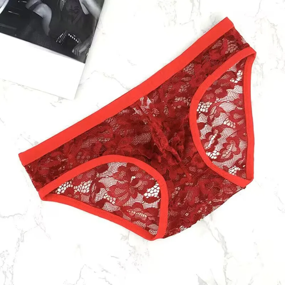 Figi damskie o klasycznym kroju z ażurową koronką na całej powierzchni. Model posiada umiarkowane wycięcie na biodrach oraz gładkie, wąskie lamówki w pasie i przy nogawkach. Wzór koronki inspirowany jest motywami kwiatowymi i roślinnymi, z różnym stopniem prześwitów w poszczególnych partiach.