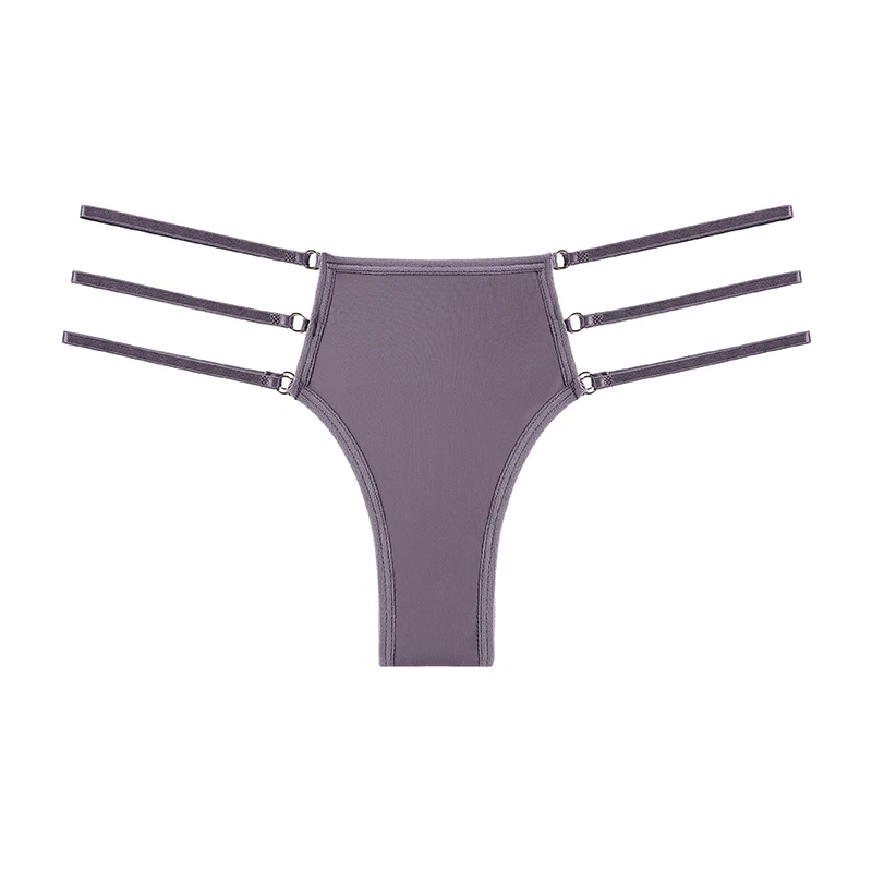 Figi damskie o niskim stanie z trzema poziomymi paskami po bokach, połączonymi z główną częścią majtek za pomocą małych metalowych kółeczek. Model wykonany w technologii bezszwowej, charakteryzuje się gładką powierzchnią i subtelnym połyskiem. Przód ma klasyczny, dopasowany krój.