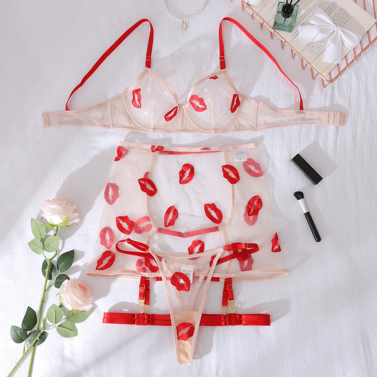 Dwuczęściowy komplet bielizny damskiej składający się z biustonosza na fiszbinach o kroju plunge oraz krótkiej, dopasowanej spódniczki mini. Biustonosz posiada regulowane ramiączka i zapięcie na plecach. Całość wykonana z prześwitującego materiału z haftami w kształcie ust oraz kontrastową lamówką. Spódniczka uzupełniona jest o ozdobne paski z metalowymi regulatorami i sprzączkami. W zestawie znajdują się również majtki o mocno wyciętym fasonie.