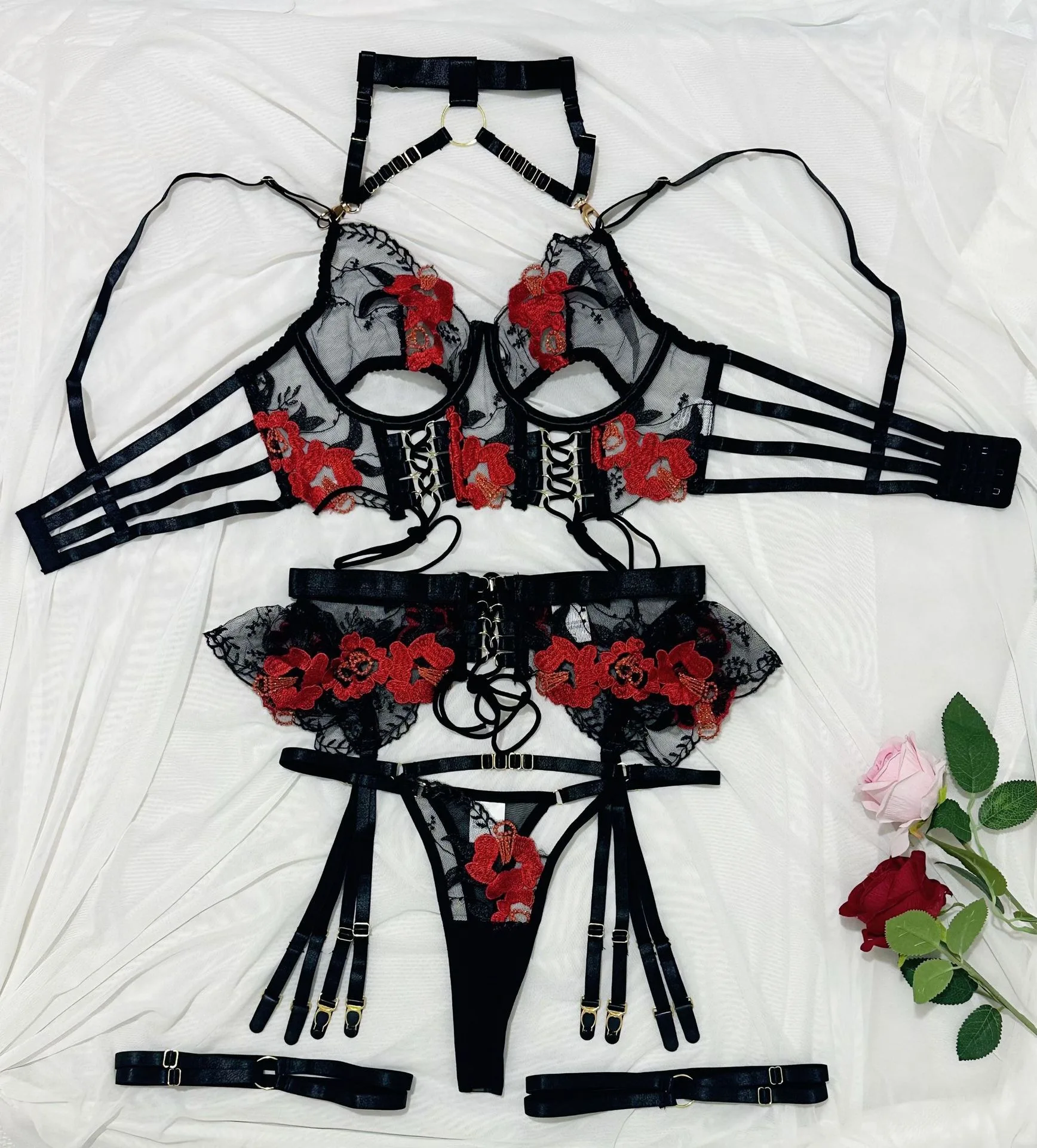 Komplet składa się z długiej braletki z otwartymi miseczkami, ozdobionymi haftem o motywie kwiatowym oraz wiązaniem gorsetowym ze złotymi oczkami i kokardką. Choker na szyję połączony jest z miseczkami cienkimi paskami z metalowymi detalami. Dół tworzą majtki z falbanką, haftem i wiązaniem gorsetowym oraz paskami do pończoch z regulacją.