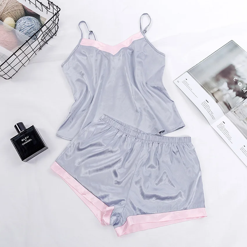 Dwuczęściowy komplet piżamowy składa się z luźnego topu na cienkich ramiączkach z dekoltem w kształcie litery V oraz krótkich szortów z elastyczną gumką w pasie. Oba elementy mają kontrastujące obszycia i połyskliwą powierzchnię. Nogawki szortów są lekko zaokrąglone i wykończone jasnym obszyciem, które współgra z detalem na topie.