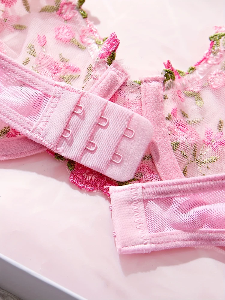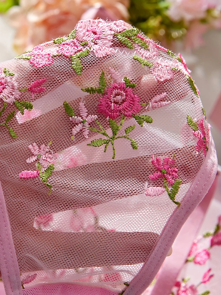 Dwuczęściowy komplet bielizny damskiej obejmuje biustonosz z przezroczystymi miseczkami typu soft, wzmocnionymi fiszbinami i regulowanymi ramiączkami. Model ozdobiony jest haftem kwiatowym na miseczkach i stringach. Stringi posiadają wąski panel oraz cienkie, regulowane boczne paski. Całość utrzymana w spójnym wzornictwie z dekoracyjnym wykończeniem.