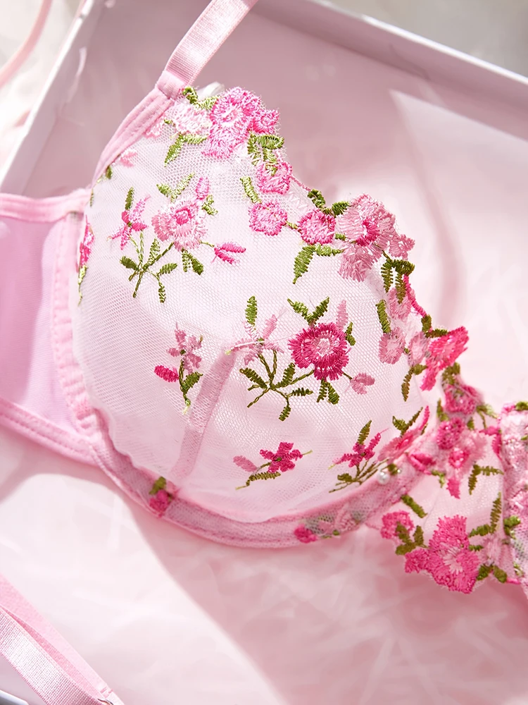 Komplet z haftem kwiatowym: biustonosz z fiszbinami i stringi