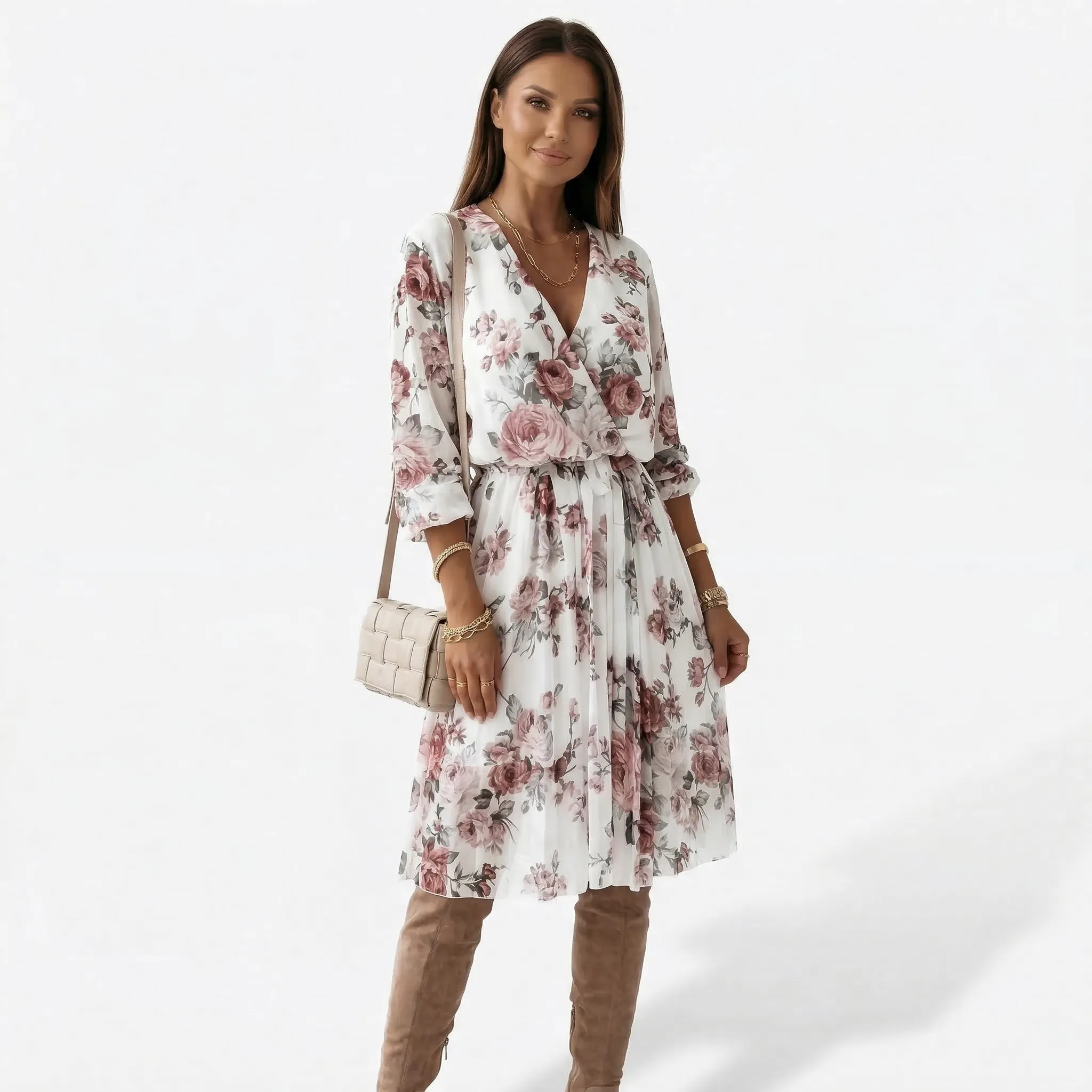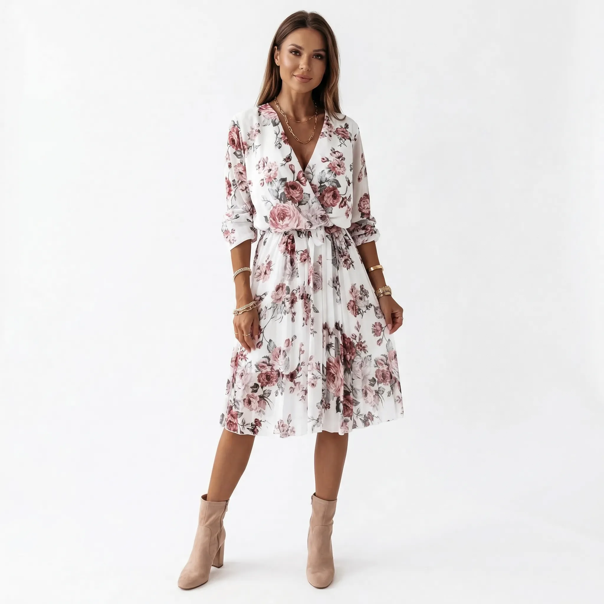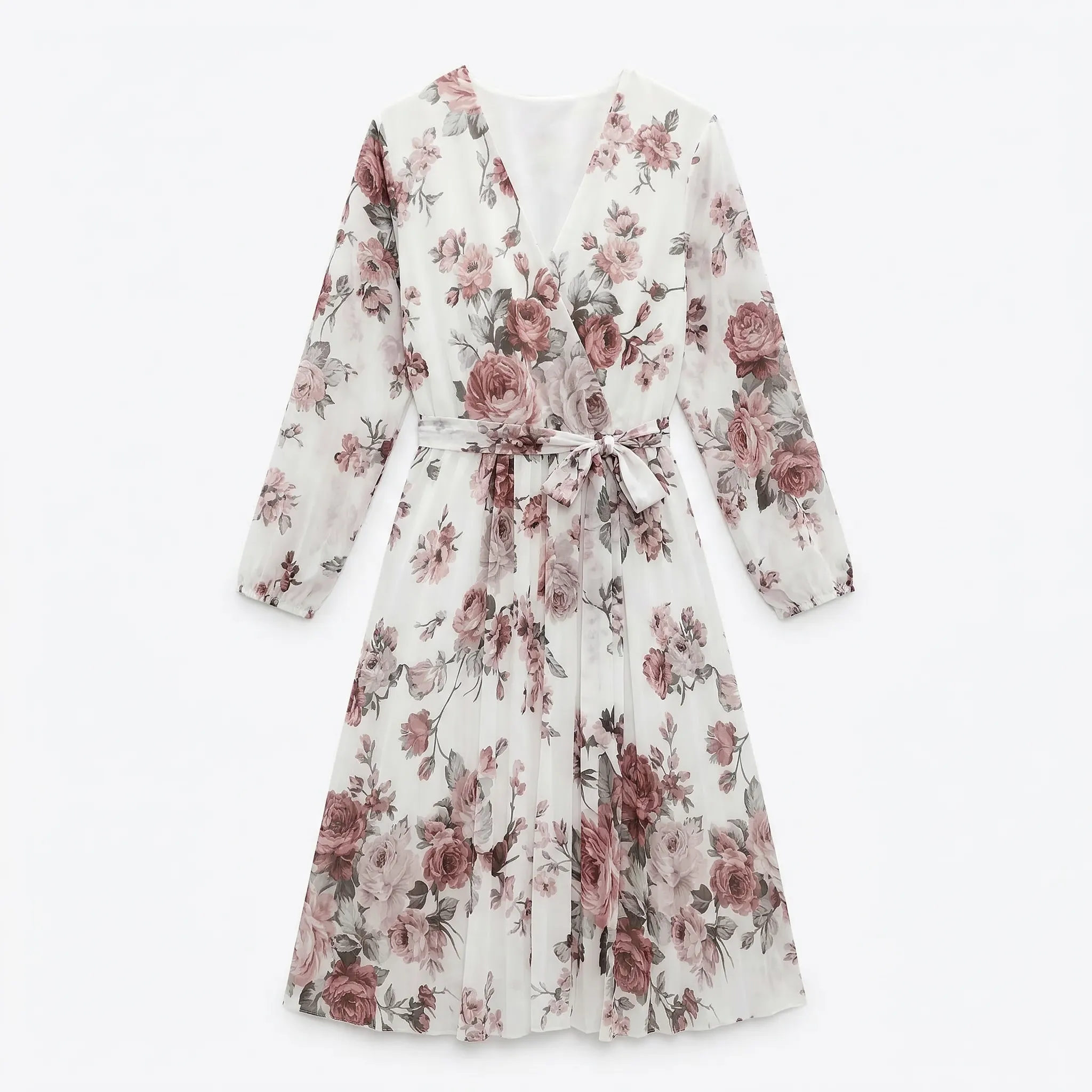kopertowy fason, dekolt w serek, długość midi, plisowana spódnica, wiązany pas, długie rękawy, kwiatowy wzór