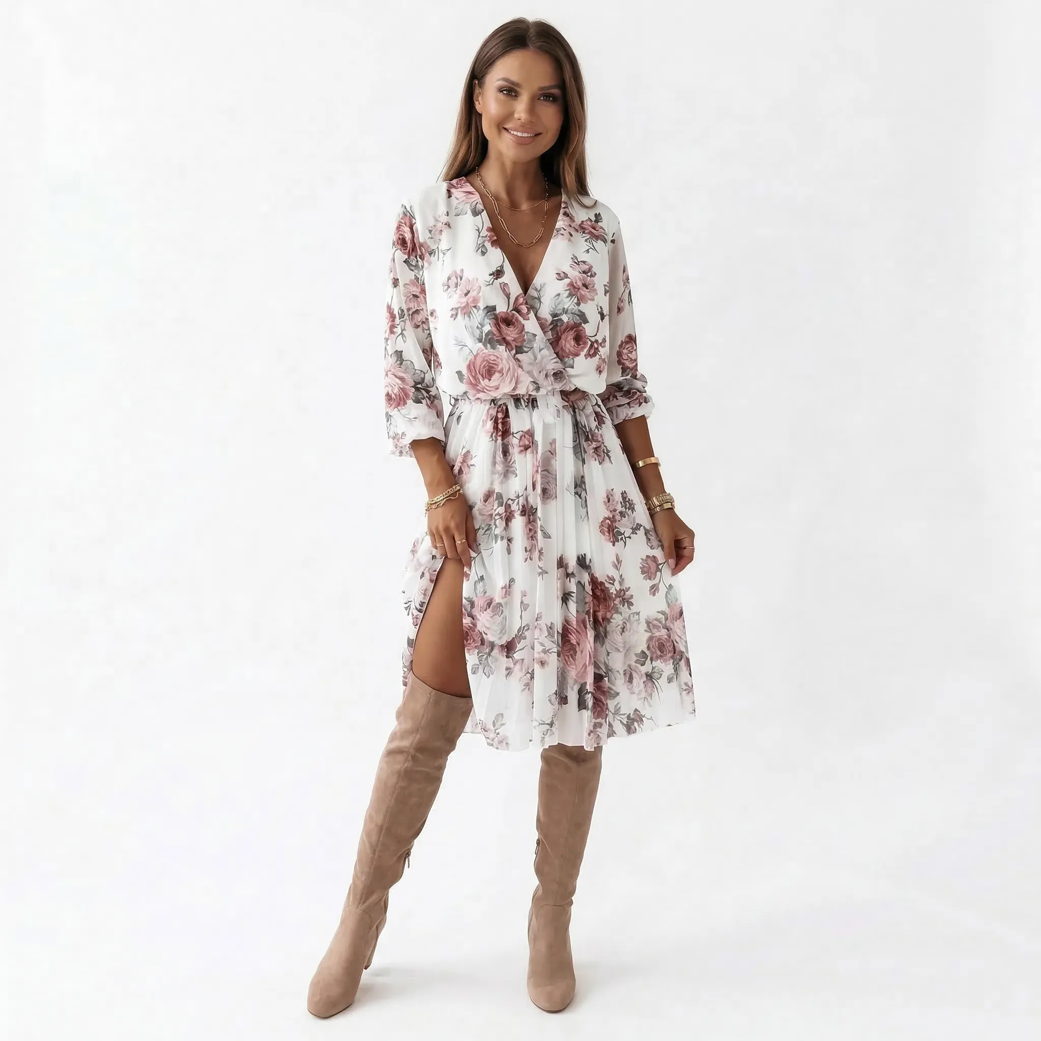 Spódnica ozdobiona jest drobnymi plisami, które tworzą miękko opadające fale przy każdym kroku, a asymetryczne ułożenie materiału odsłania subtelne rozcięcie nadające stylizacji zmysłowego, dynamicznego akcentu. Całość zdobi kwiatowy nadruk o romantycznym, lekko vintage’owym charakterze, rozmieszczony w sposób harmonijny na całej powierzchni sukienki.