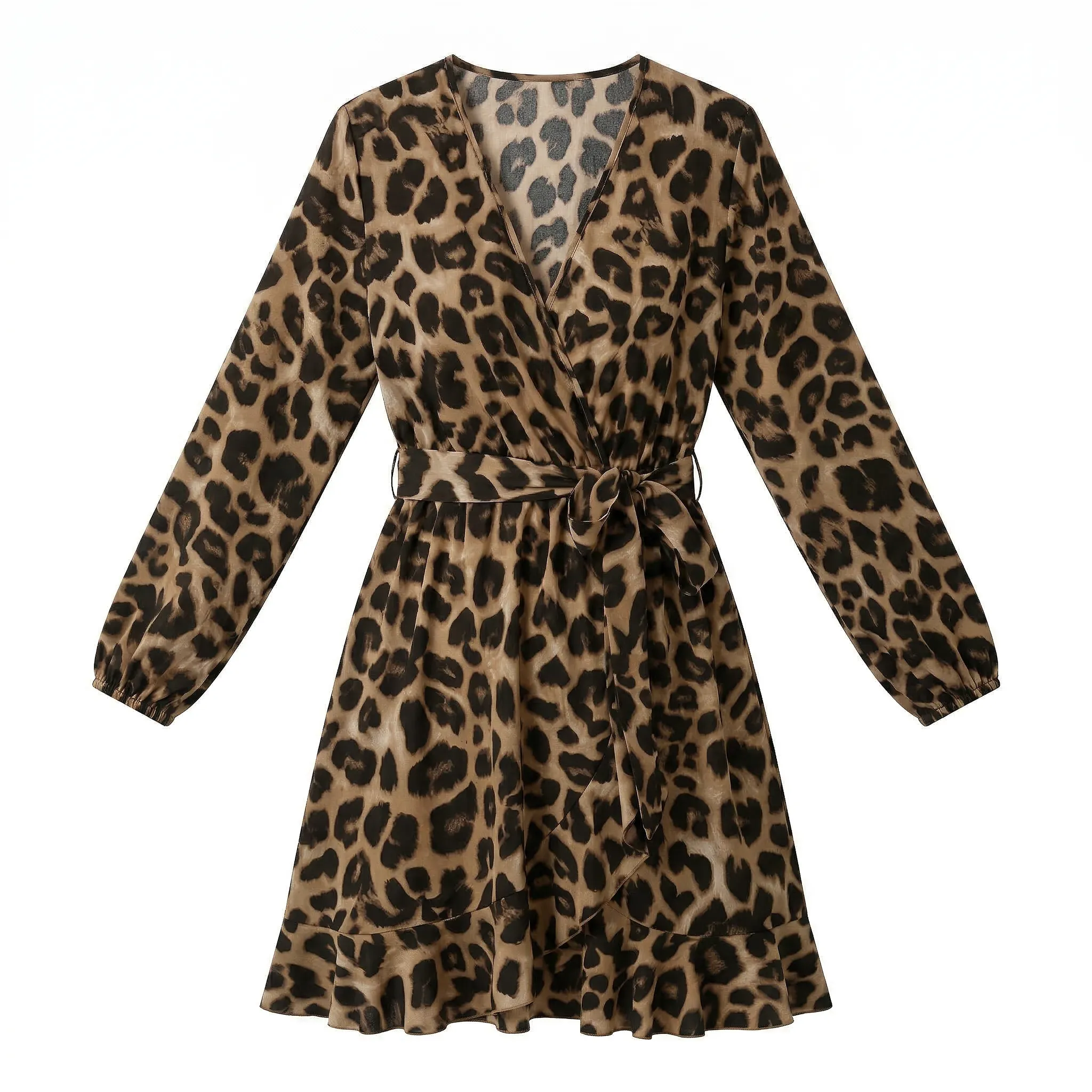 kopertowy dekolt, wiązanie w talii, falbana, długi rękaw, krótka długość, zwierzęcy wzór