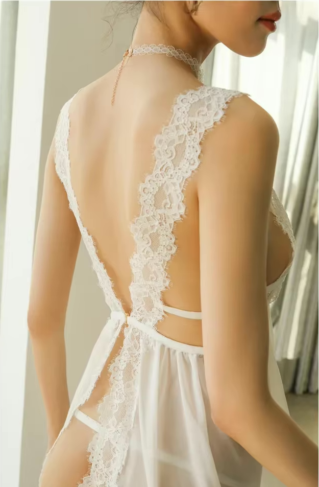 Koszula nocna z koronkowym chokerem i głębokim wycięciem w kształcie litery V z przodu, ozdobionym koronką. Ramiączka przechodzą na plecy, tworząc dekoracyjny wzór. Tył jest w pełni odkryty, z metalowym zapięciem w dolnej części pleców. Dół wykonany z transparentnego, luźno opadającego materiału z wysokimi rozcięciami po bokach i koronkowym wykończeniem.