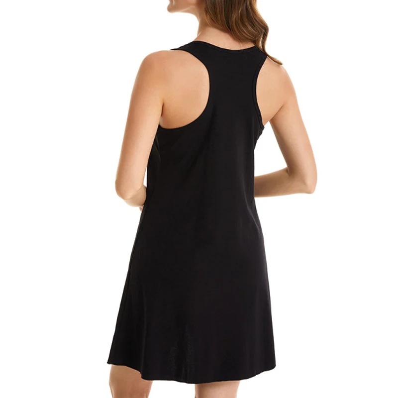 Koszula nocna damska o luźnym kroju typu A-line, rozszerzana od linii biustu w dół. Model bez rękawów, z cienkimi ramiączkami zbiegającymi się na plecach w fasonie racerback. Długość mini sięga powyżej kolan. Wykończona prostym dołem, bez dodatkowych zdobień, guzików, zamków czy kieszeni.