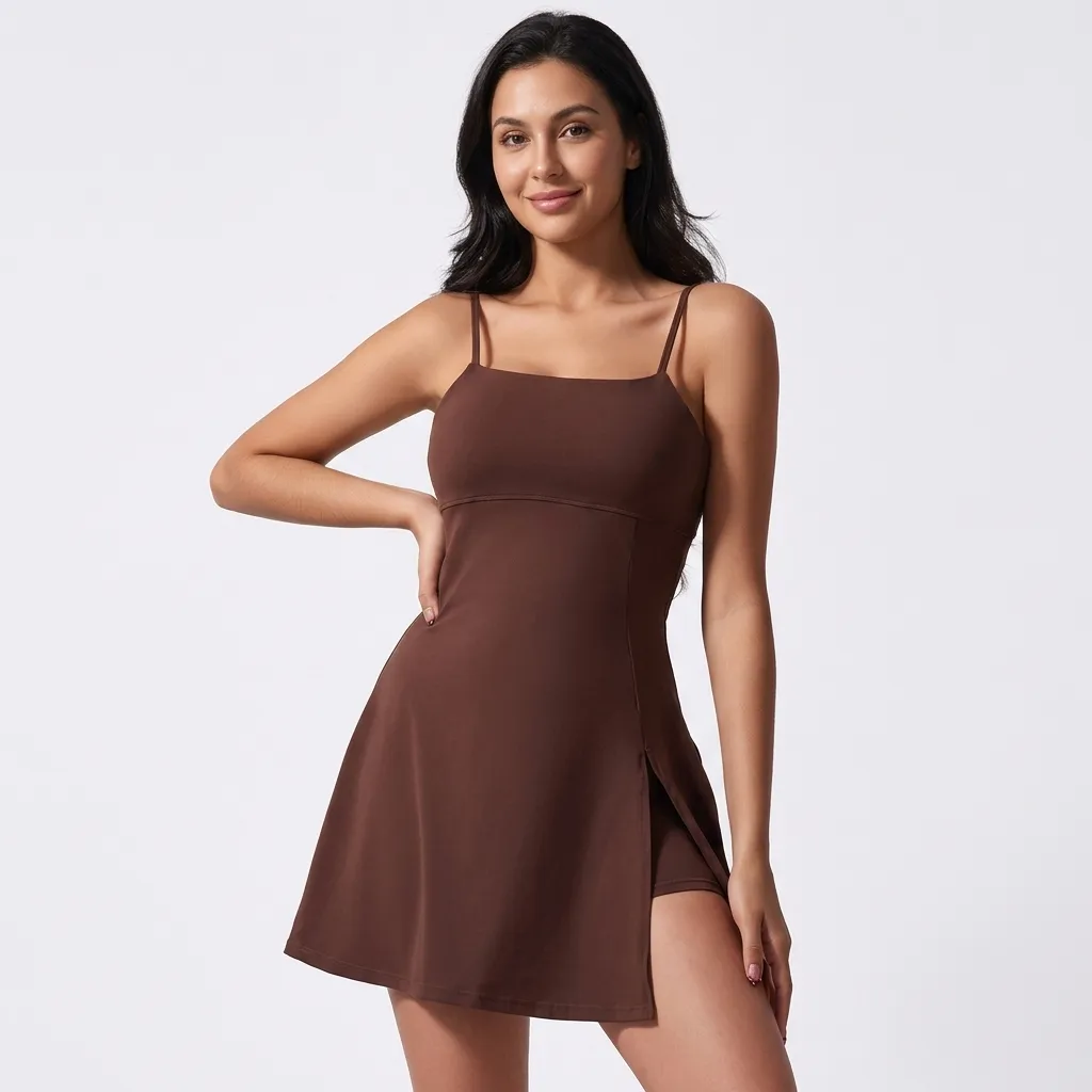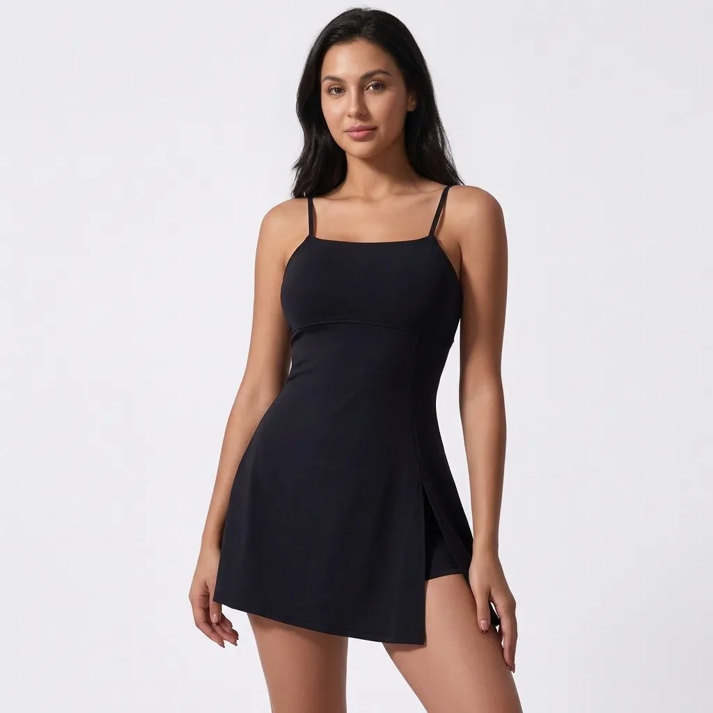 cienkie ramiączka, wbudowane szorty, wycięcie na plecach, boczne rozcięcia