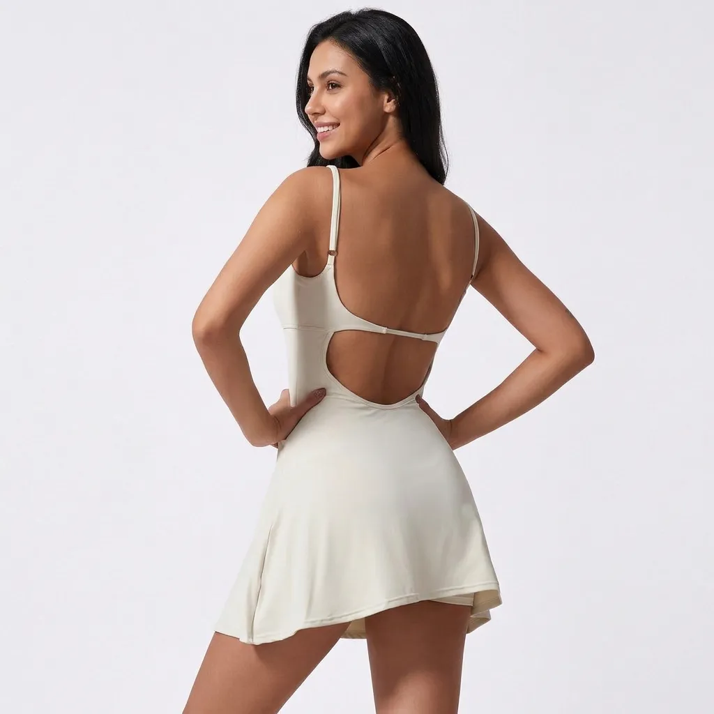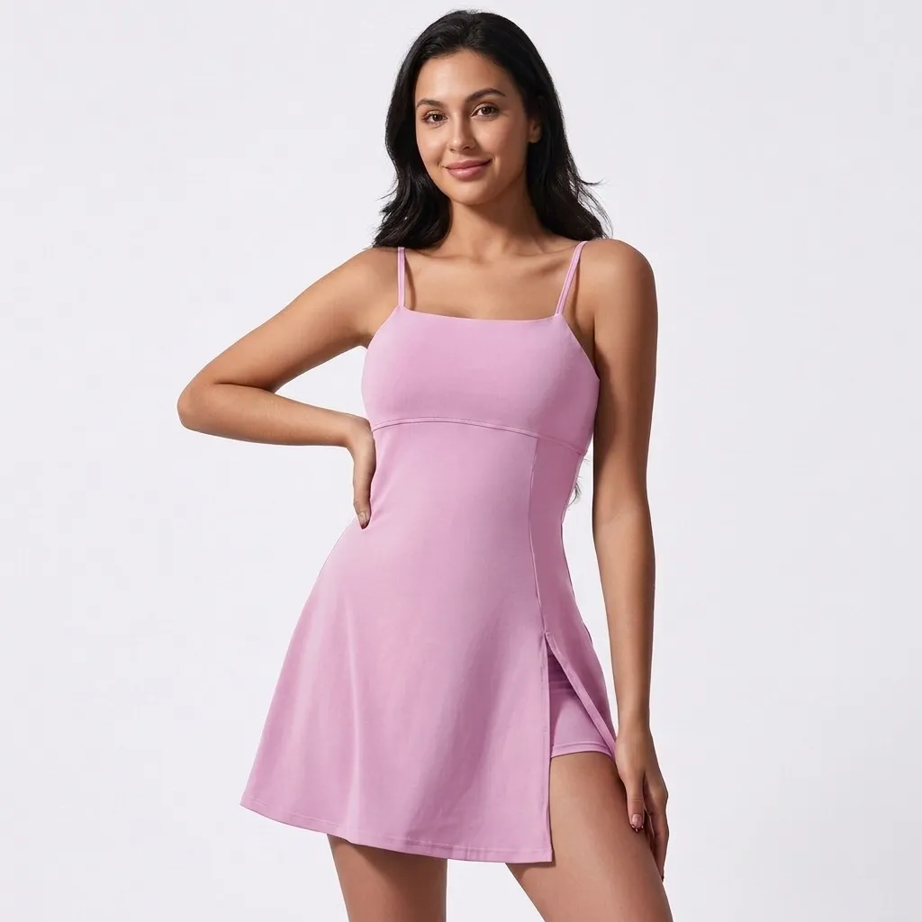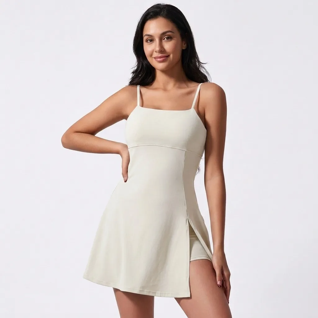 Rozkloszowany dół układa się w miękką falę przy każdym ruchu, a pojedyncze boczne rozcięcie odsłania krótki, wbudowany spodenkowy wkład, dodając stylizacji figlarnego charakteru. Asymetryczne nakładanie tkanin przy rozcięciu tworzy ciekawą grę warstw i subtelny detal, który ożywia całość bez nadmiernej dekoracji.