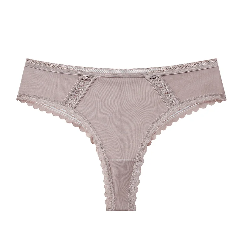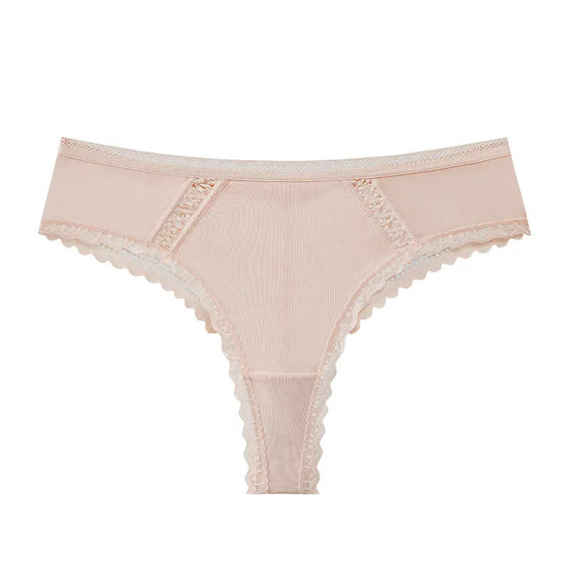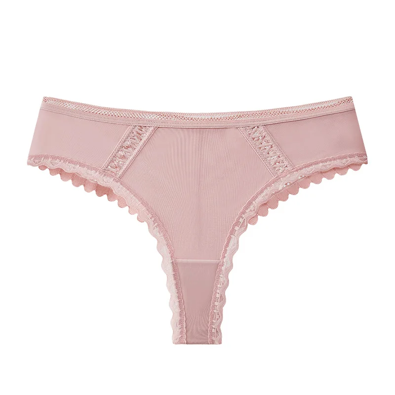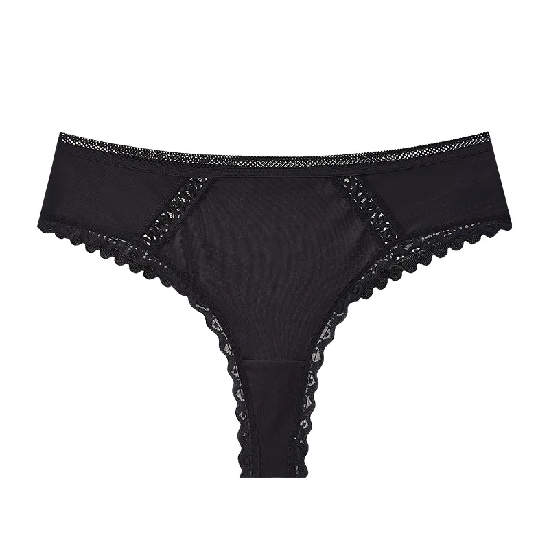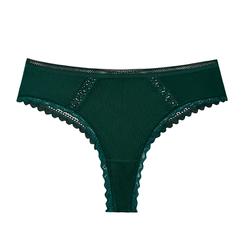 Niski stan, Podwyższona linia nogawek, Falbankowa koronka na krawędziach, Półprzezroczysty pas w górnej części, Ażurowe wstawki po bokach, Gładka główna część