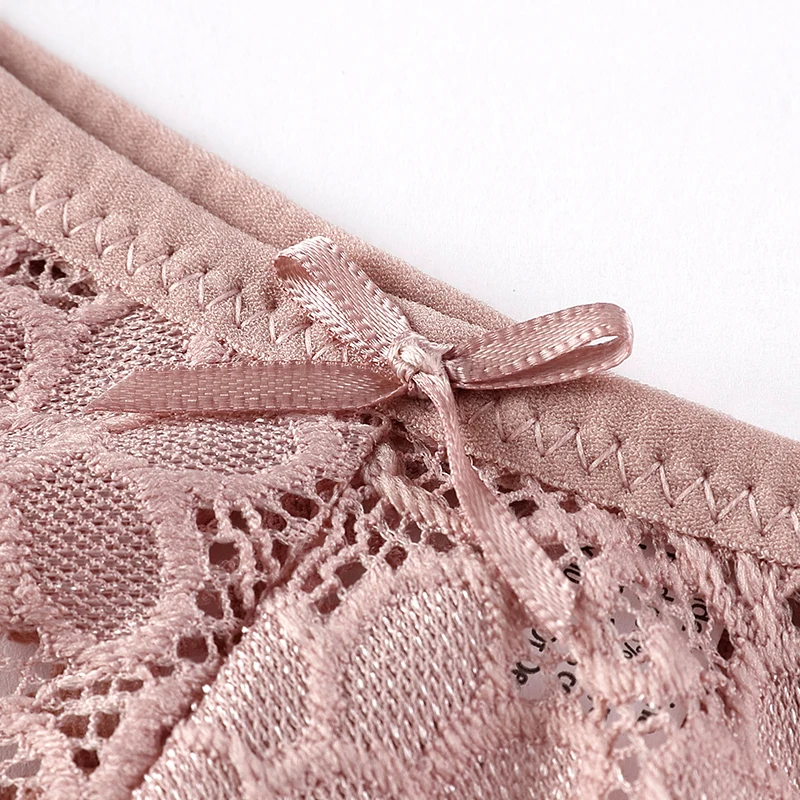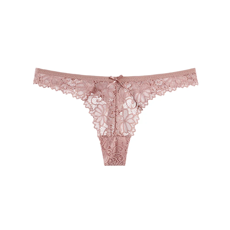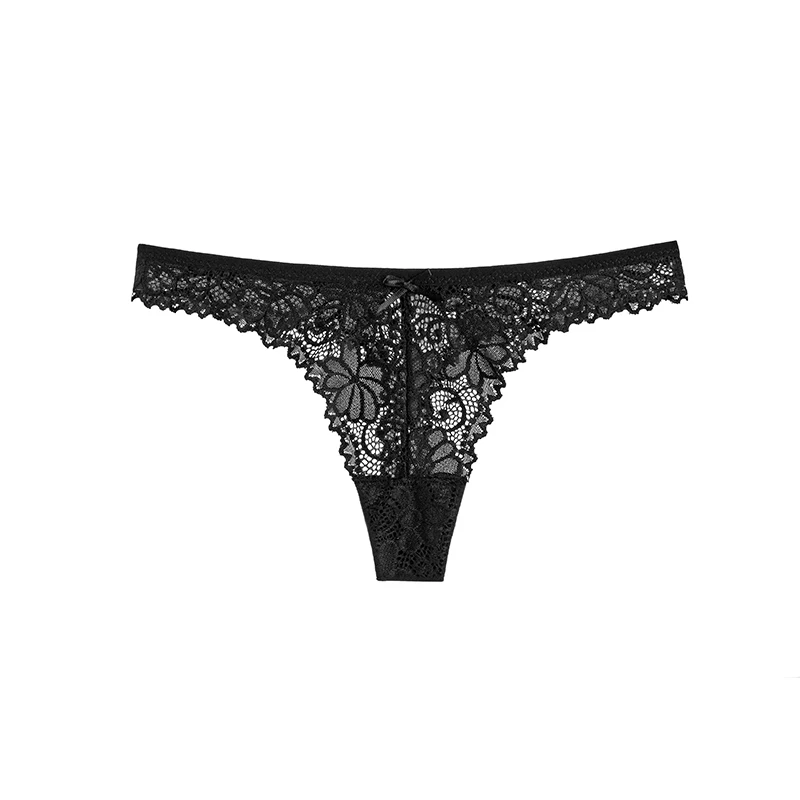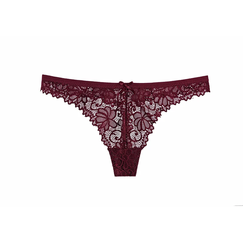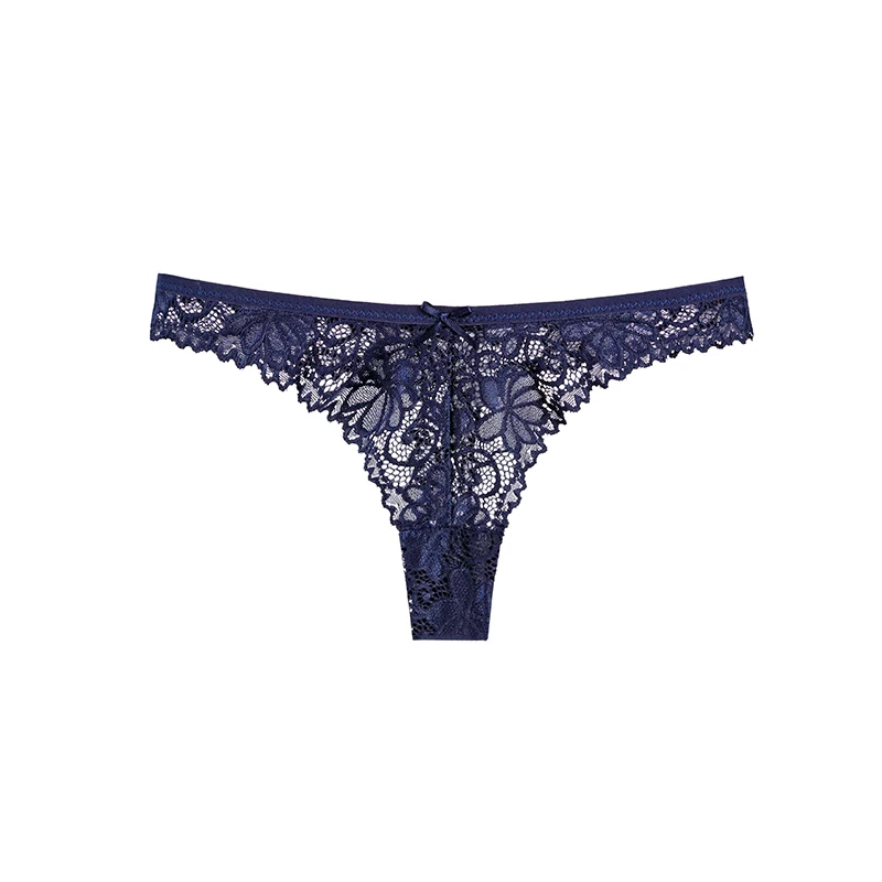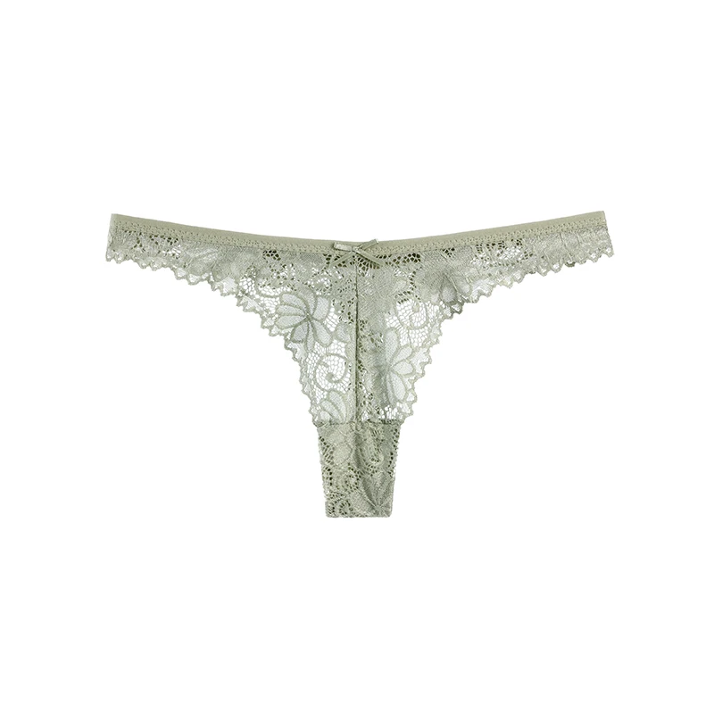 Damskie majtki o kroju z minimalnym pokryciem, wykonane z koronki o motywach roślinnych lub kwiatowych. Model ma niski stan, wyraźnie zarysowany przód w kształcie litery V oraz wysoko wycięte linie wokół ud. Górna krawędź i wycięcia na uda wykończone są falistym brzegiem. Na środku przodu znajduje się niewielka kokardka.
