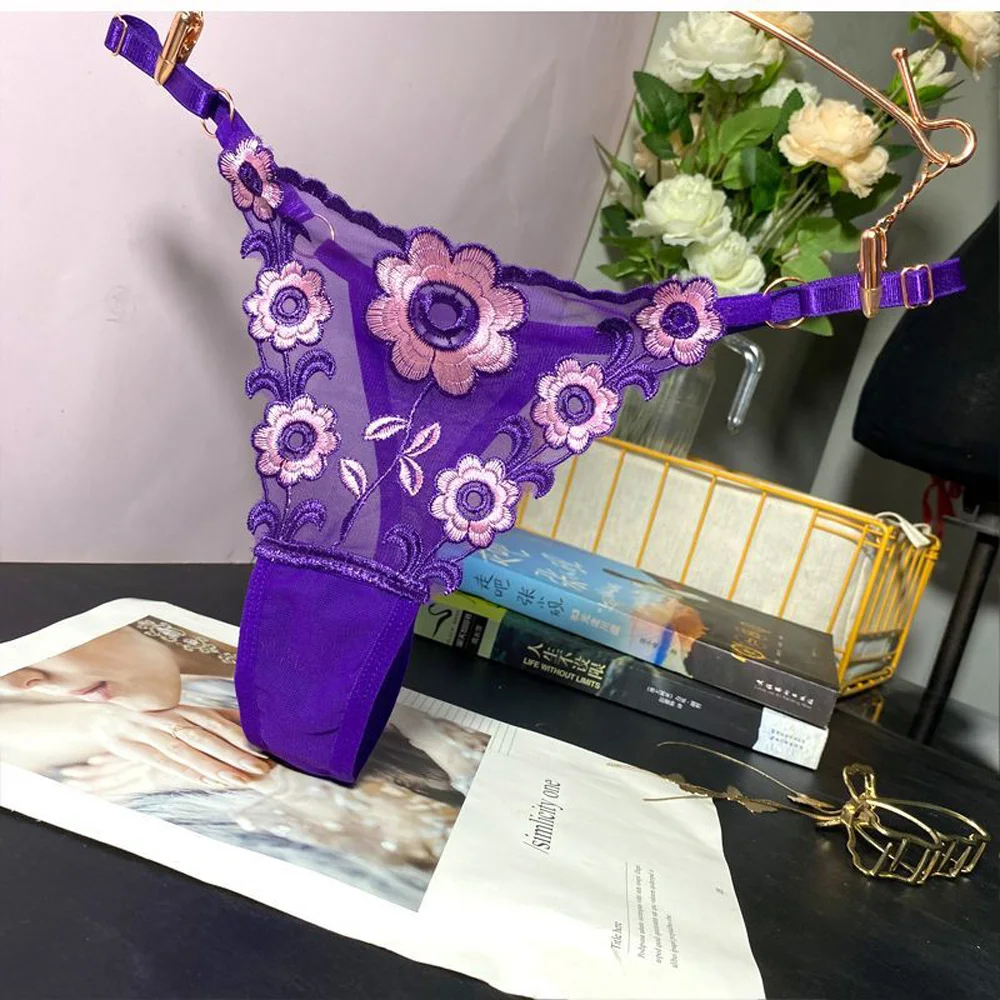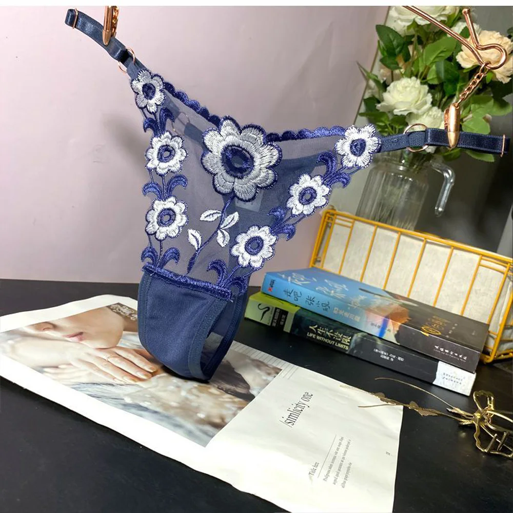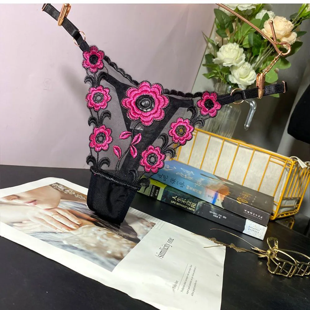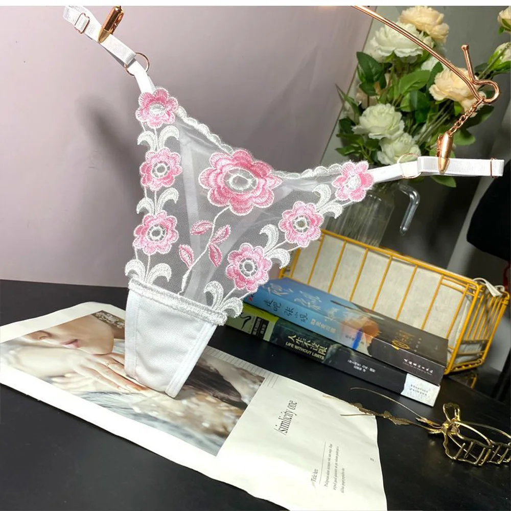 Stringi damskie z haftowanym wzorem i regulowanymi paskami