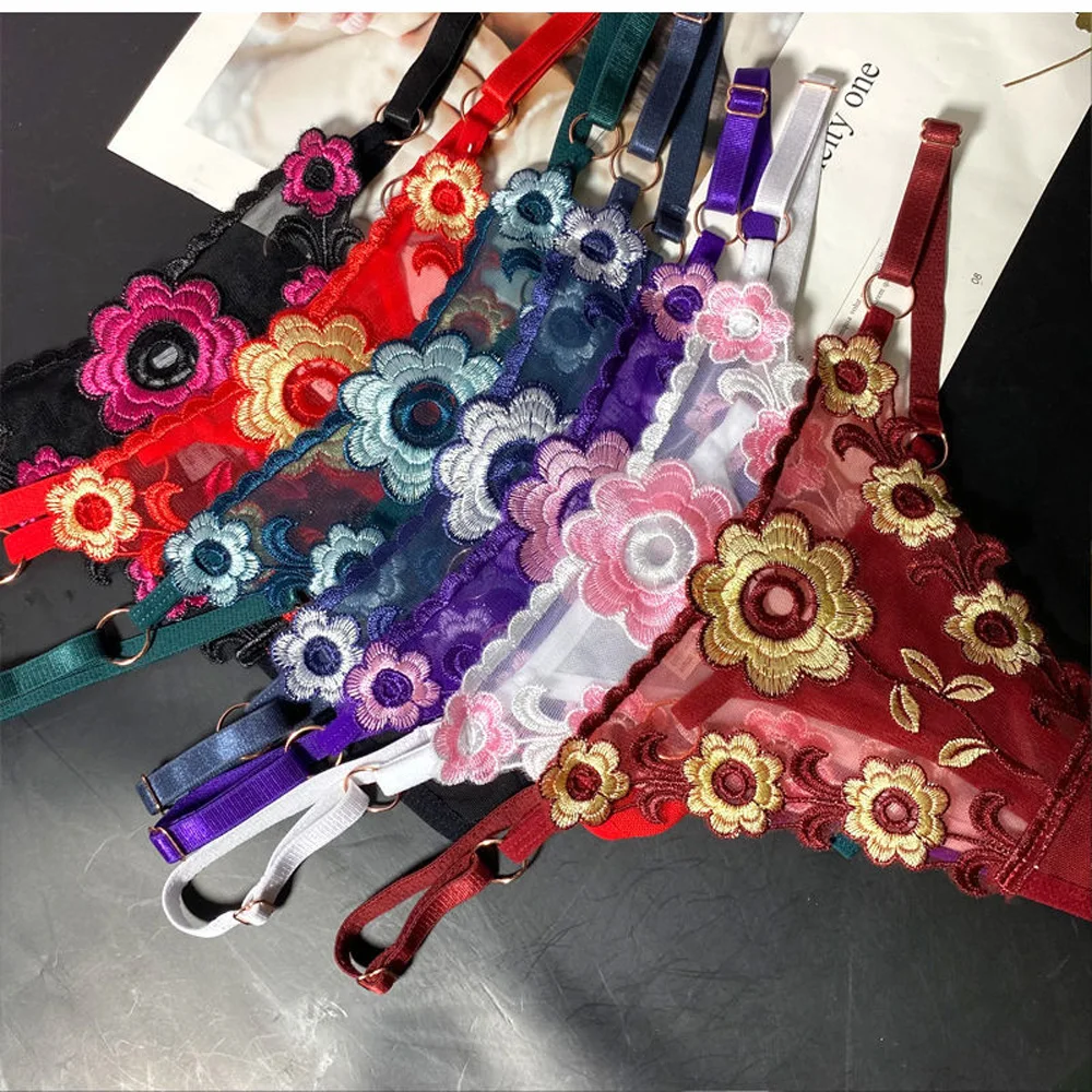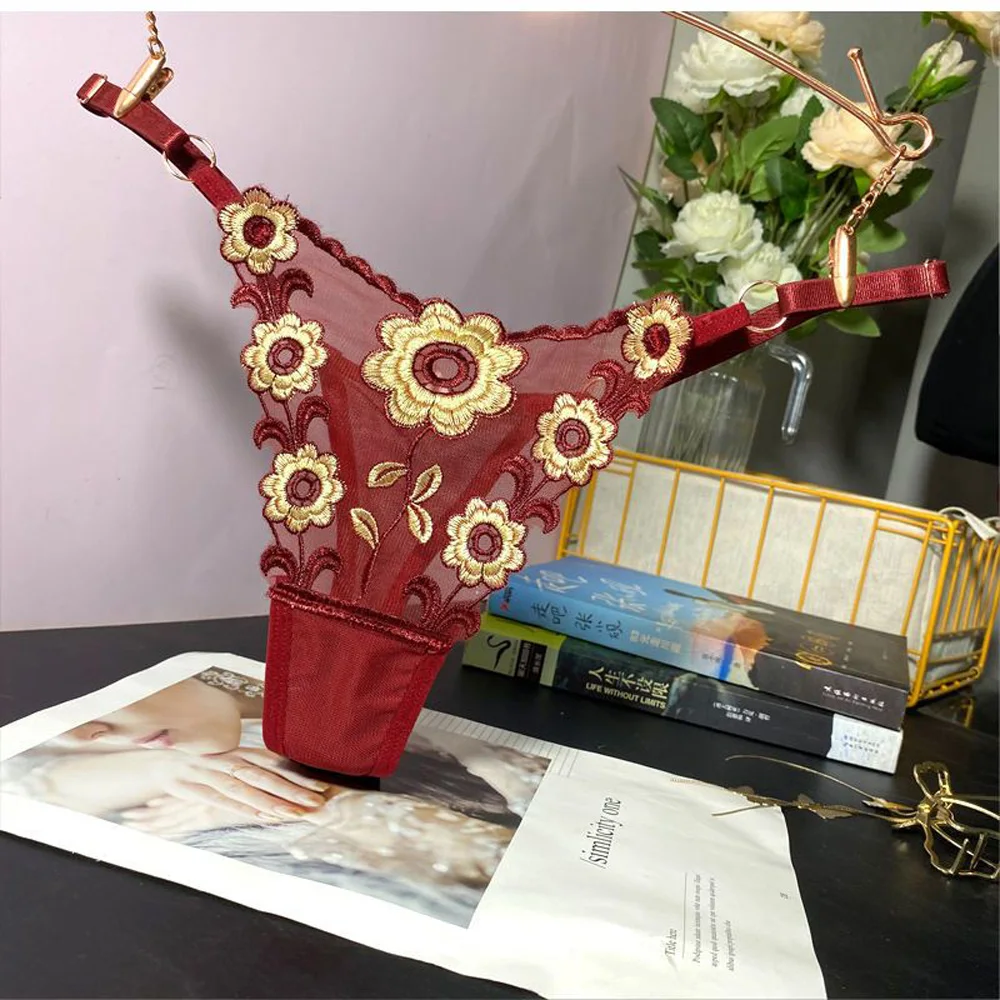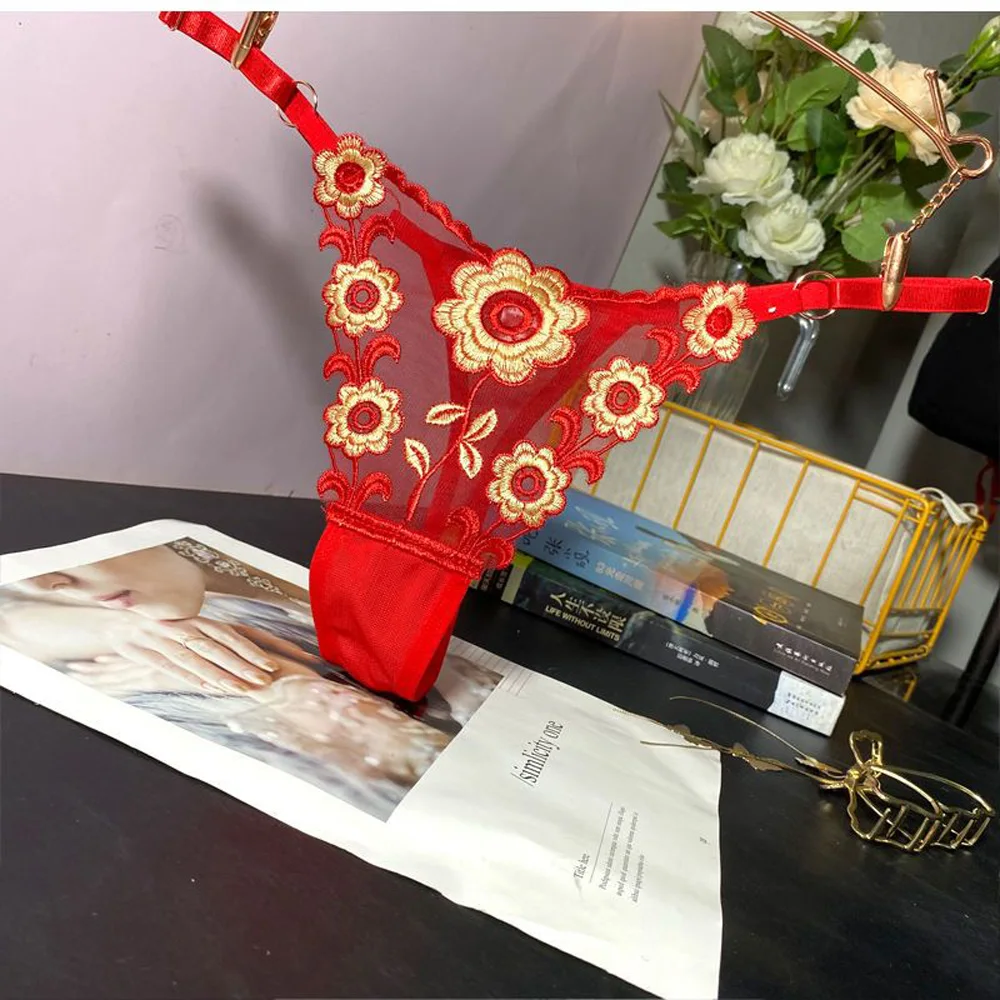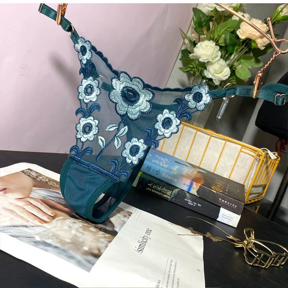 Stringi damskie z haftowanym wzorem i regulowanymi paskami