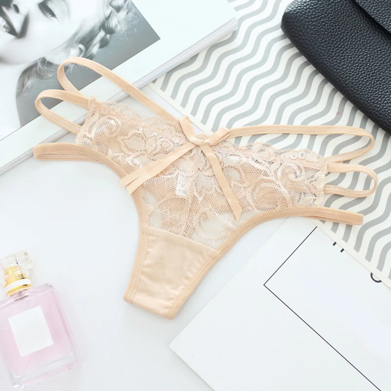 Niski stan, Ażurowa koronka, Cienkie elastyczne paski po bokach, Ozdobna kokardka na przodzie, Jednolity materiał w okolicy kroku