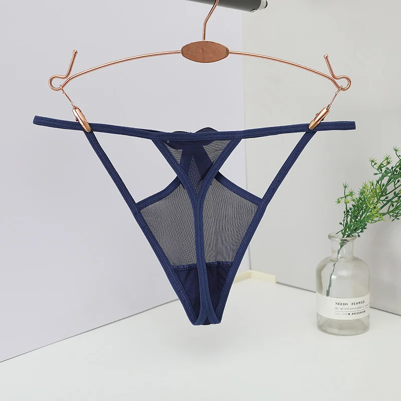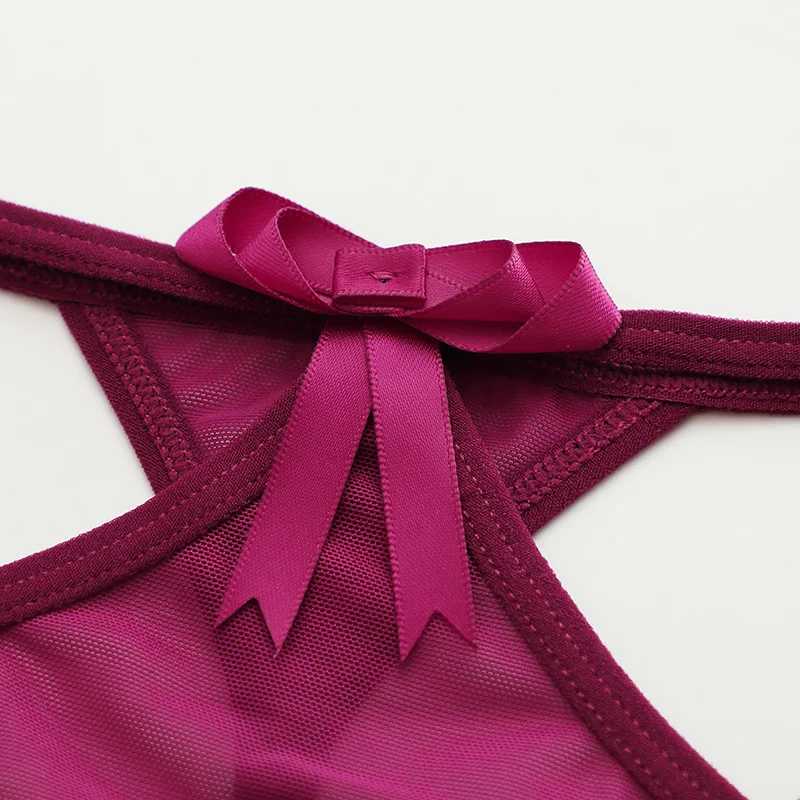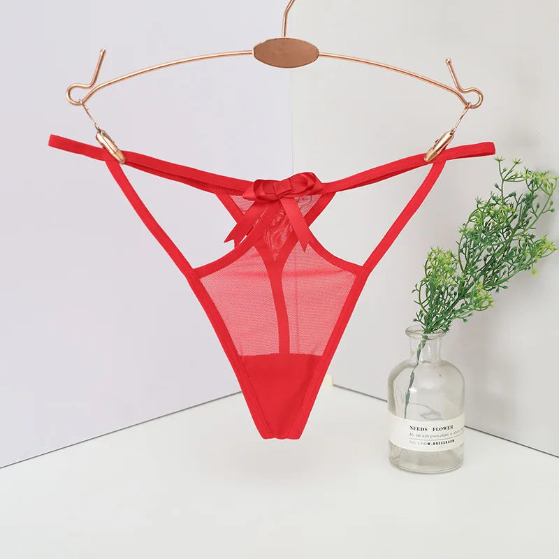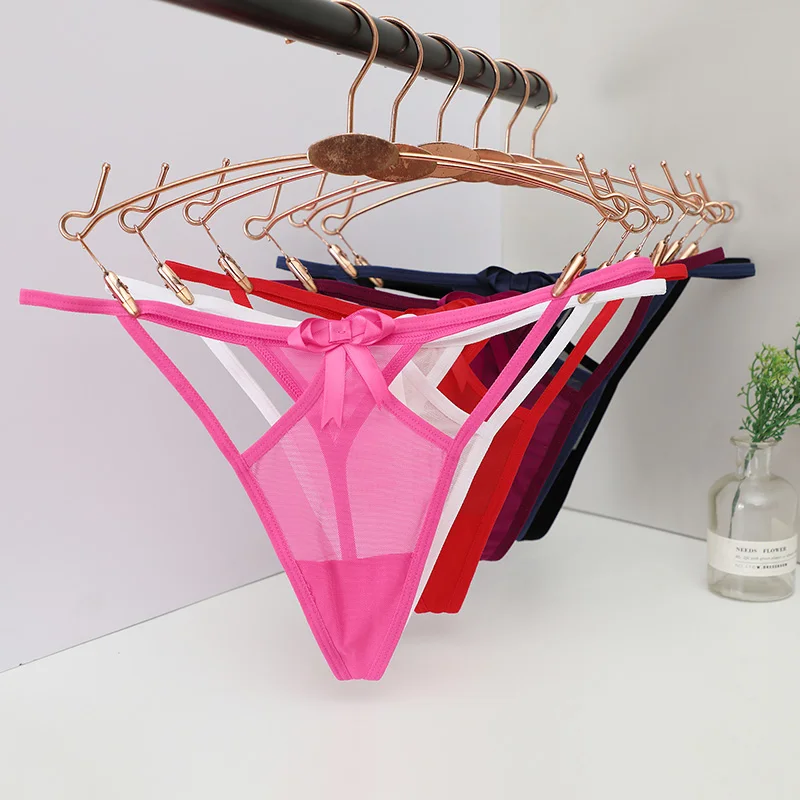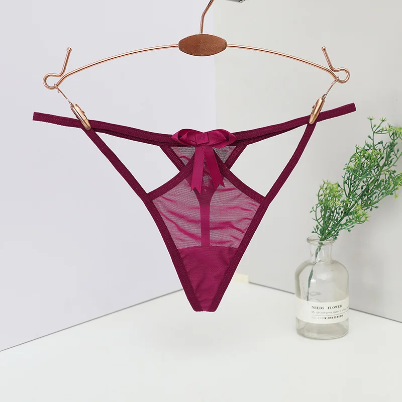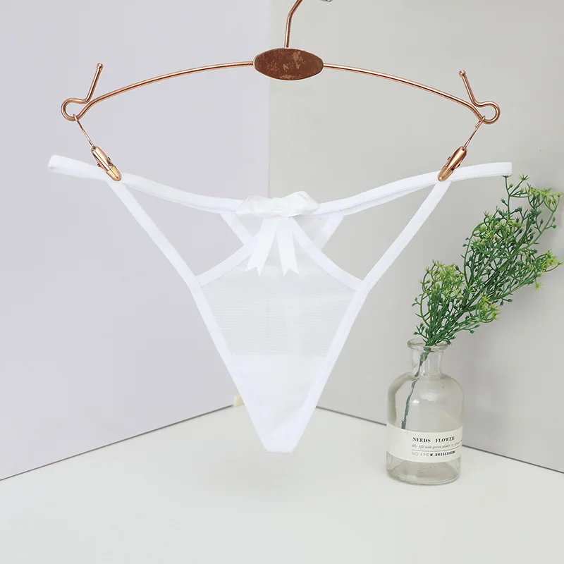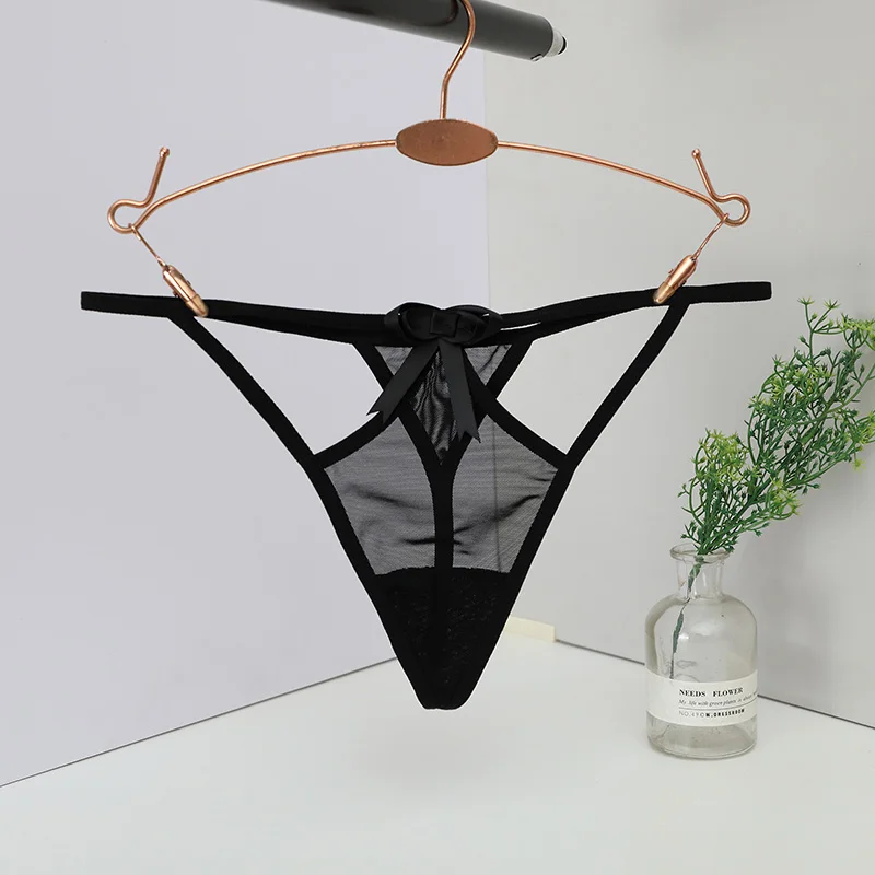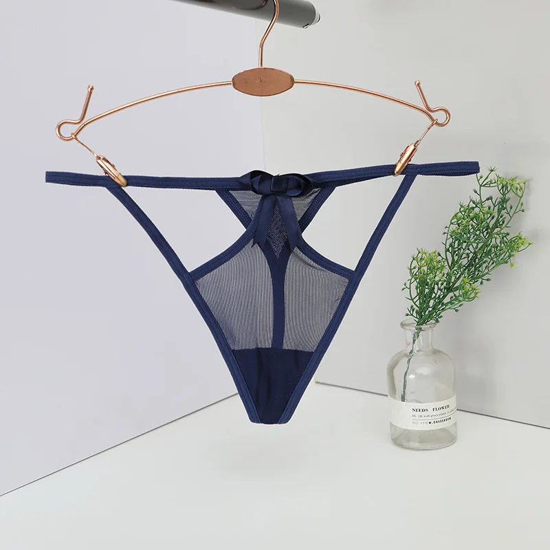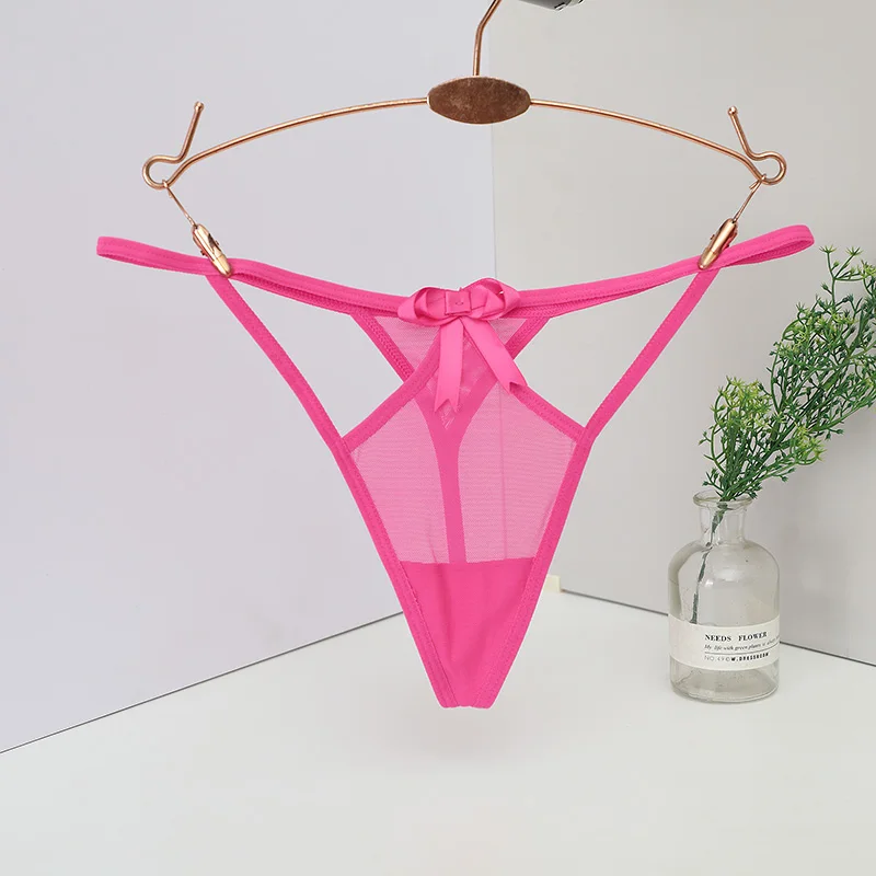 Trójkątny panel z siateczki, Cienkie elastyczne paski, Podwójne paski w górnej części bioder, Ozdobna kokardka na przodzie, Wycięty fason po bokach, Przeznaczone dla kobiet, Typ: stringi, Niski stan