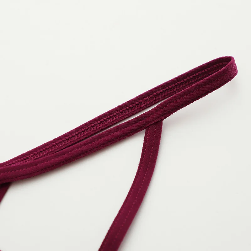 Stringi damskie o minimalistycznym kroju z trójkątnym panelem z przodu, wykonanym z delikatnej siateczki. Model posiada cienkie, elastyczne paski biegnące wzdłuż bioder oraz podwójne paski w górnej części. Na środku górnej krawędzi przedniego panelu znajduje się mała, dekoracyjna kokardka.