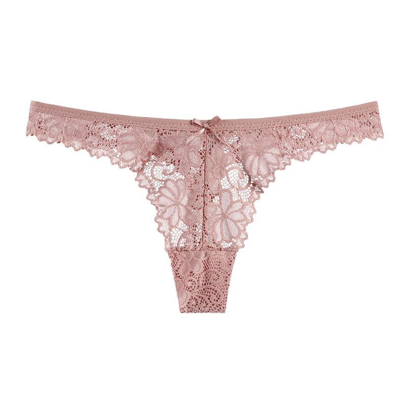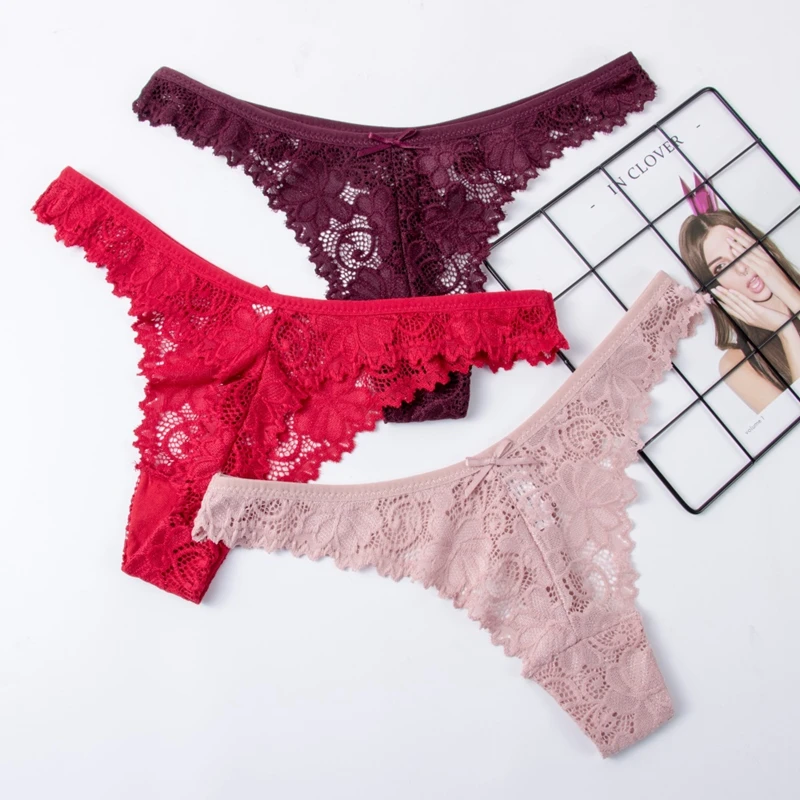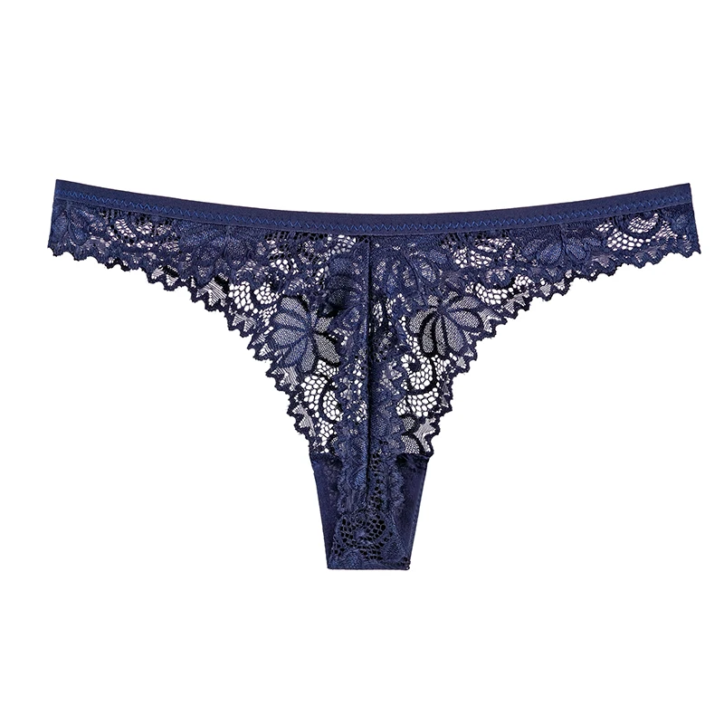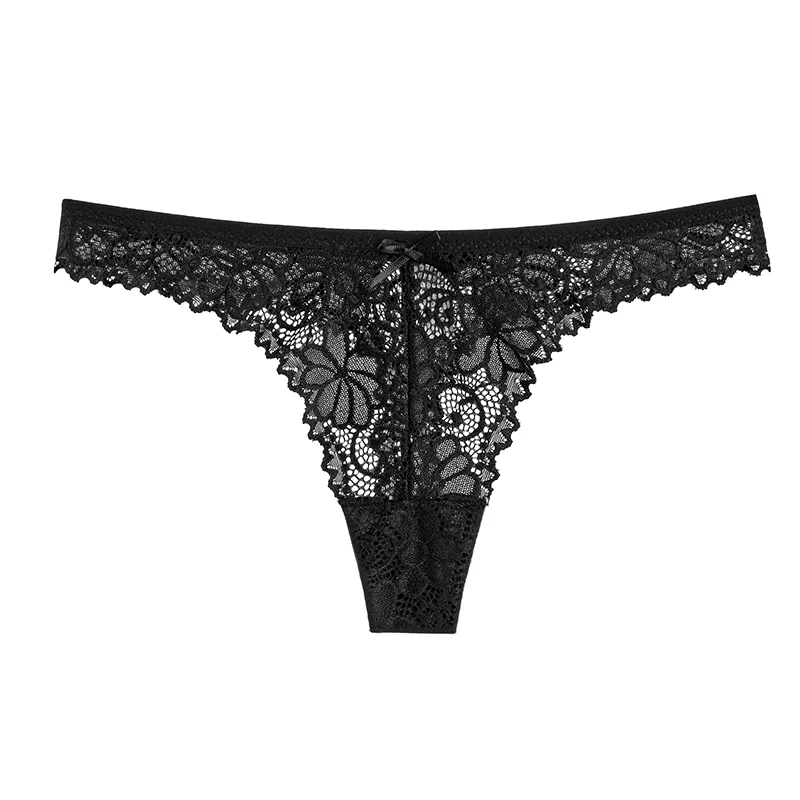 Damskie stringi o niskim stanie, wykonanych z koronki o floralnym wzorze. Każda para posiada charakterystyczne wycięcie w kształcie litery V z przodu, dekoracyjne faliste wykończenie brzegów oraz małą kokardkę umieszczoną na środku pasa. Górna krawędź wykończona jest gładkim paskiem, który płynnie łączy się z koronkową częścią.