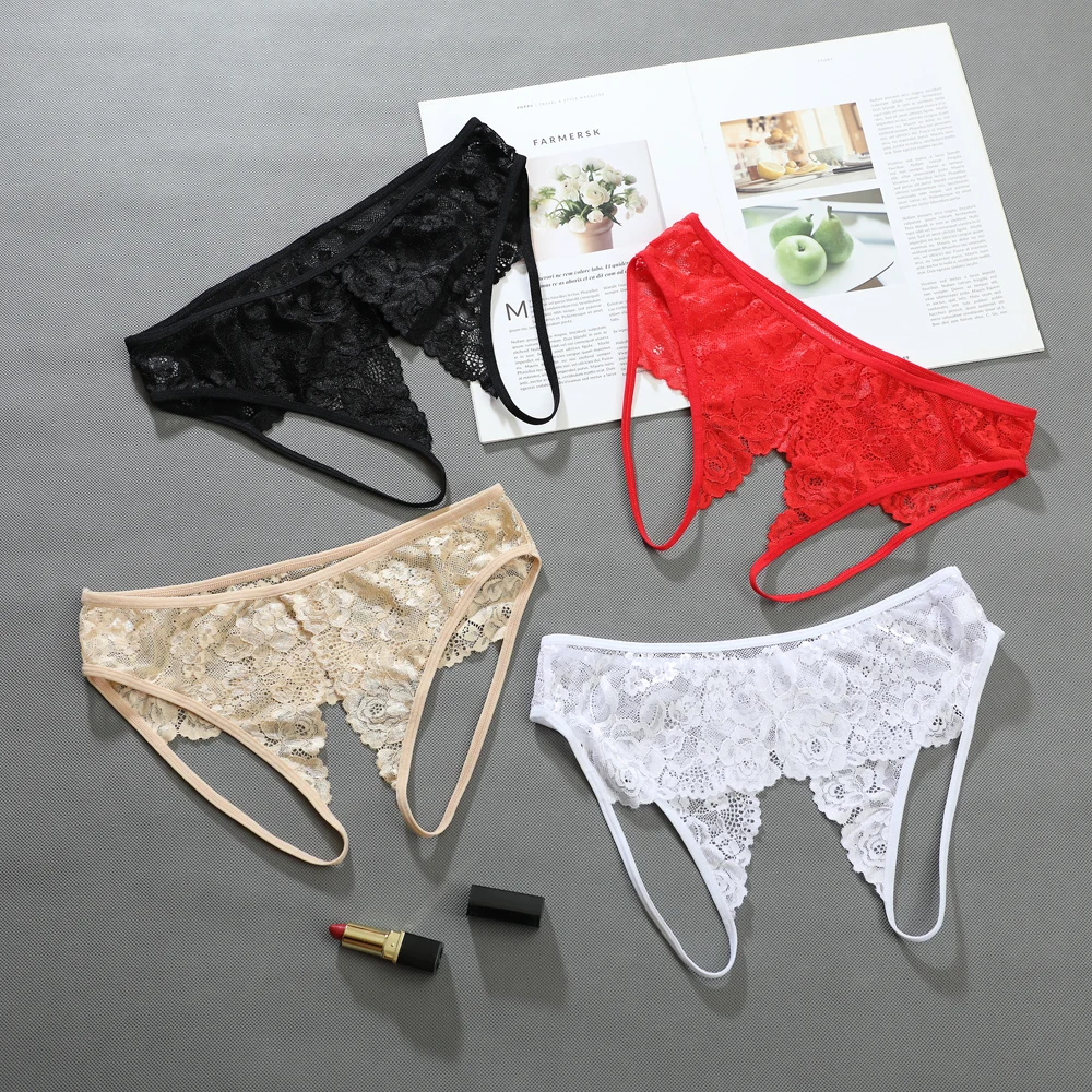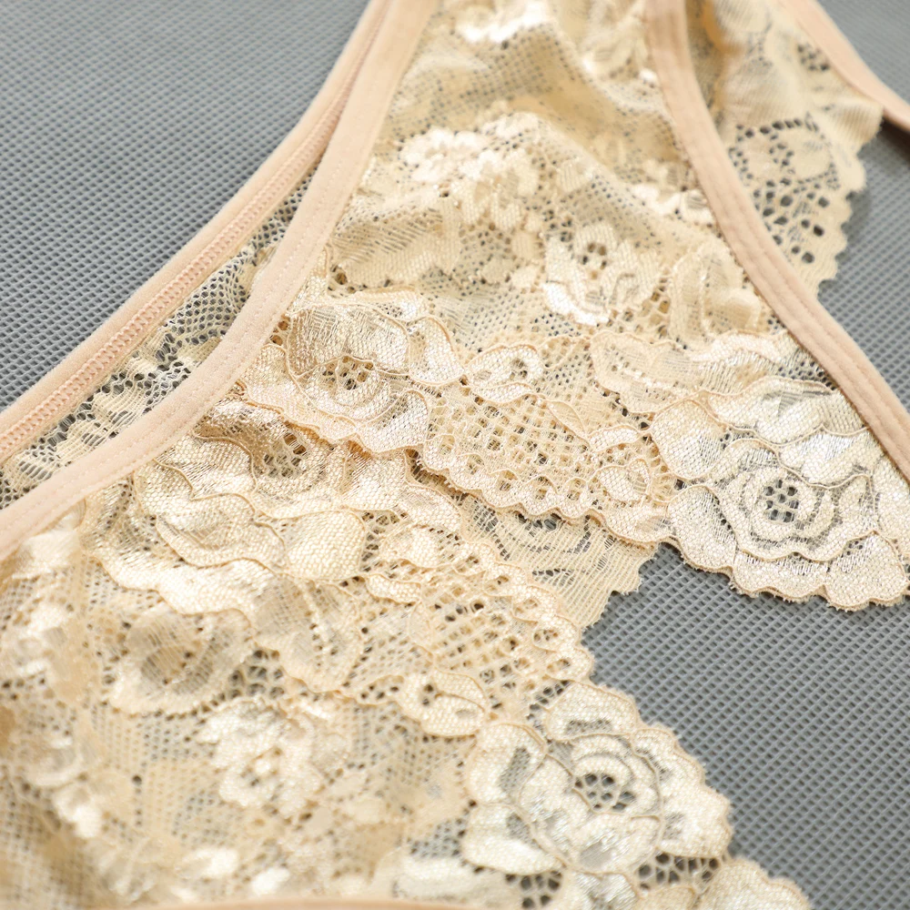 Zestaw czterech par damskich stringów z otwartym krokiem. Każda para wykonana jest z koronki o wyraźnym wzorze roślinnym. Przód stanowi szeroki panel koronki z centralnym otwarciem w kroku. Boki wykończone są cienkimi, elastycznymi paskami. Krawędzie koronki mają subtelne, faliste wykończenie.