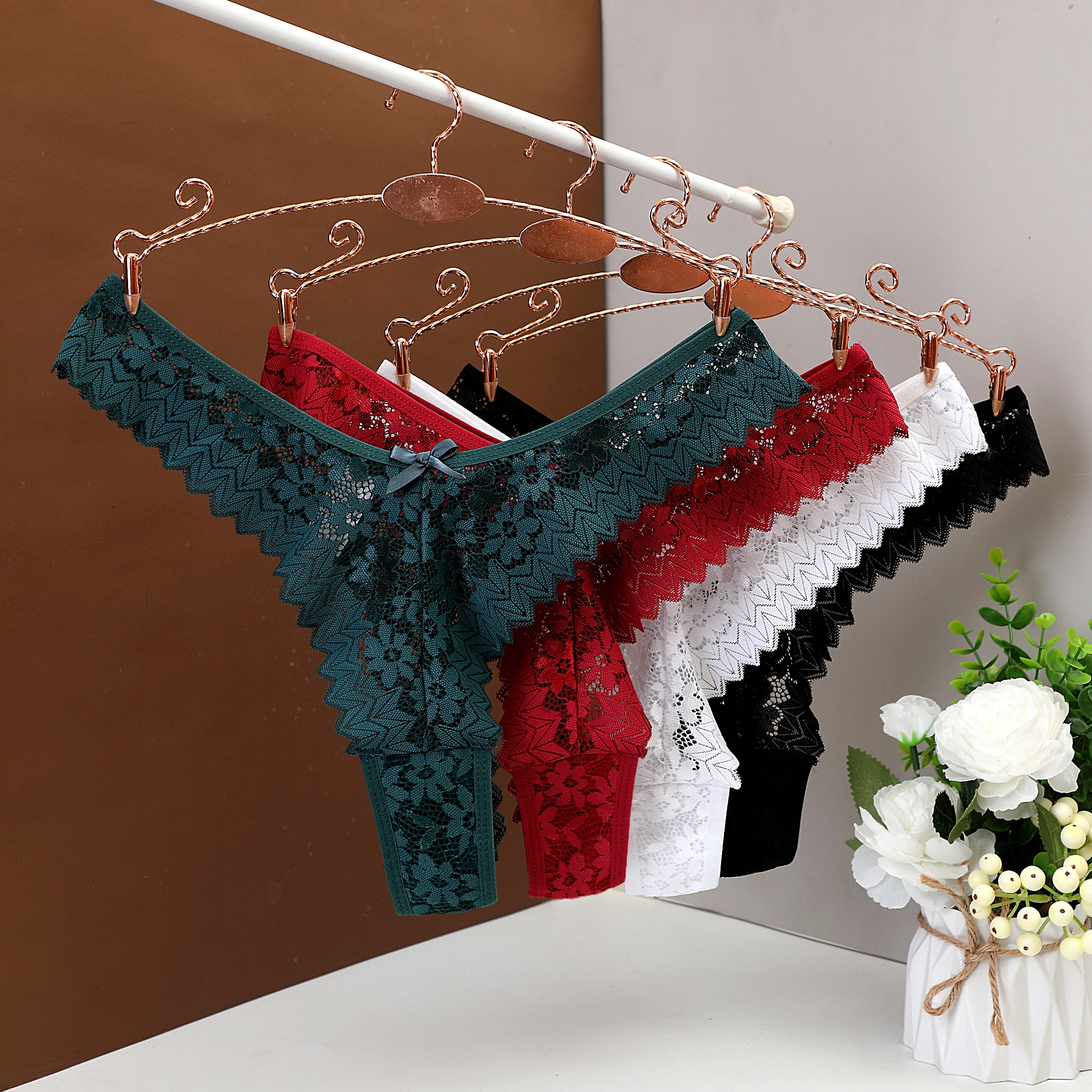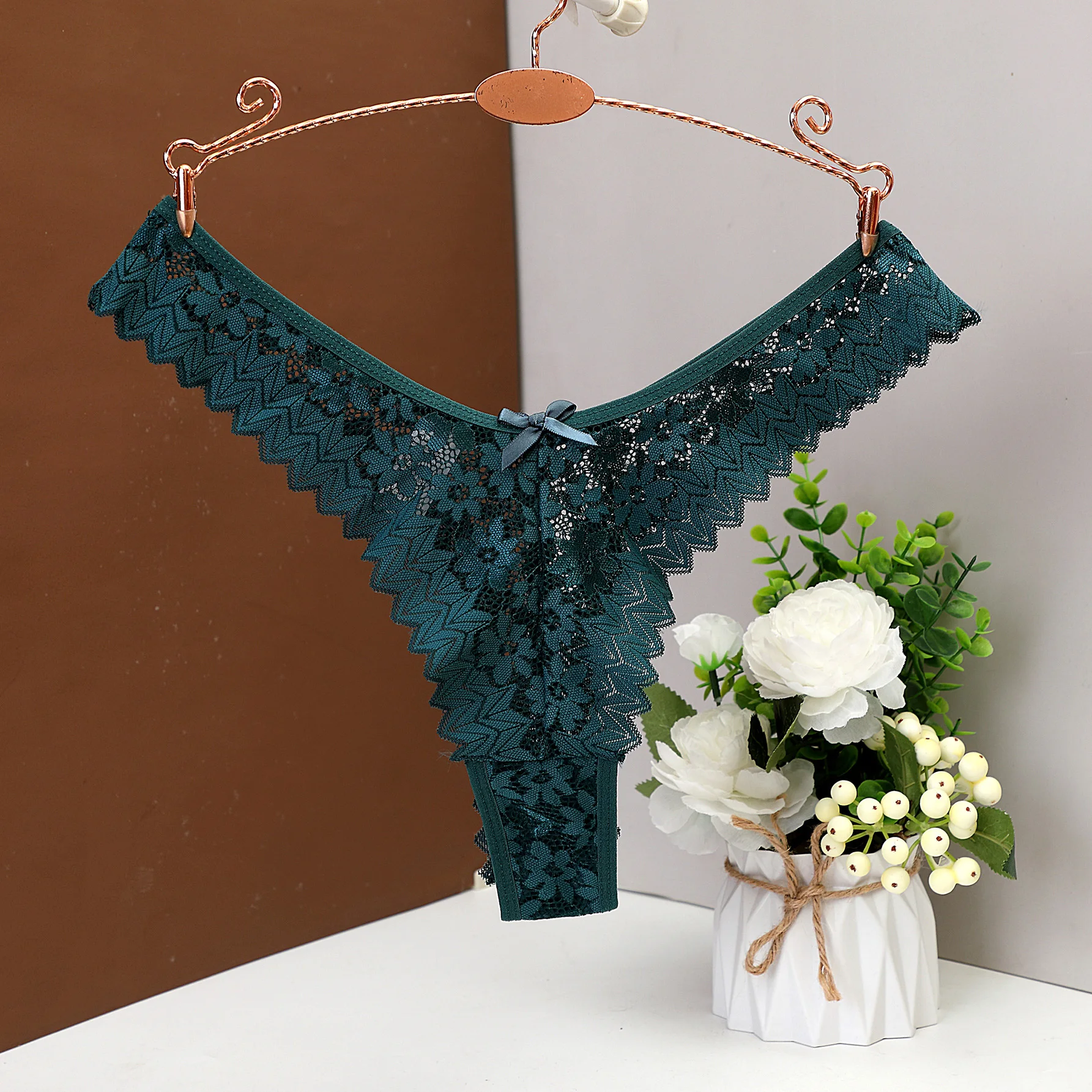 Damskie stringi wykonane z ażurowej koronki o motywach roślinnych. Model posiada wysokie wycięcia na biodrach oraz panel przedni w kształcie litery V. Krawędzie nogawek i panel przedni wykończone są ozdobnym, ząbkowanym brzegiem. Na środku pasa umieszczona jest mała, płaska kokardka. Tylny panel jest wąski i połączony z korpusem cienkim paskiem materiału.