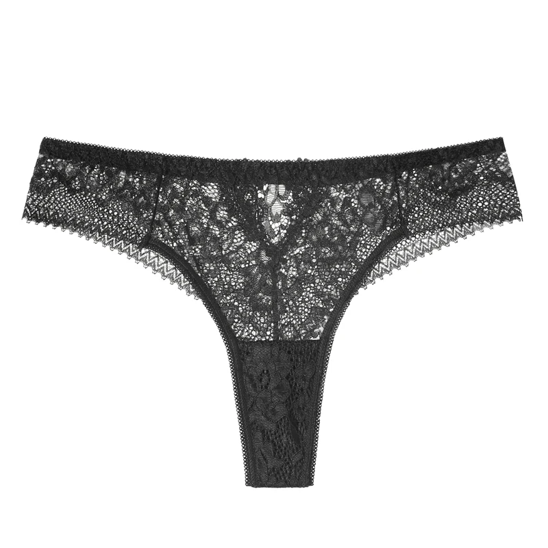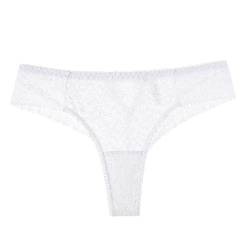 Majtki damskie o kroju stringów z niskim stanem, wykonane z przezroczystej koronki o roślinnym lub kwiatowym wzorze. Model posiada ozdobne wycięcie na plecach w kształcie łezki lub trójkąta, wykończone koronkowymi detalami. Krawędzie obszyte są drobną, falistą lamówką. Na plecach znajduje się pionowe połączenie koronki.