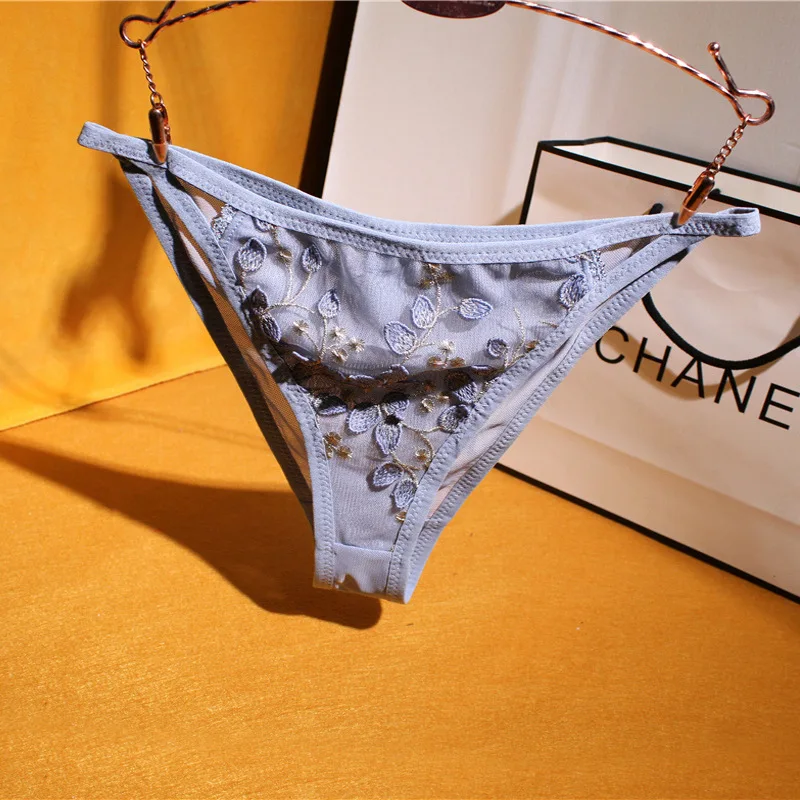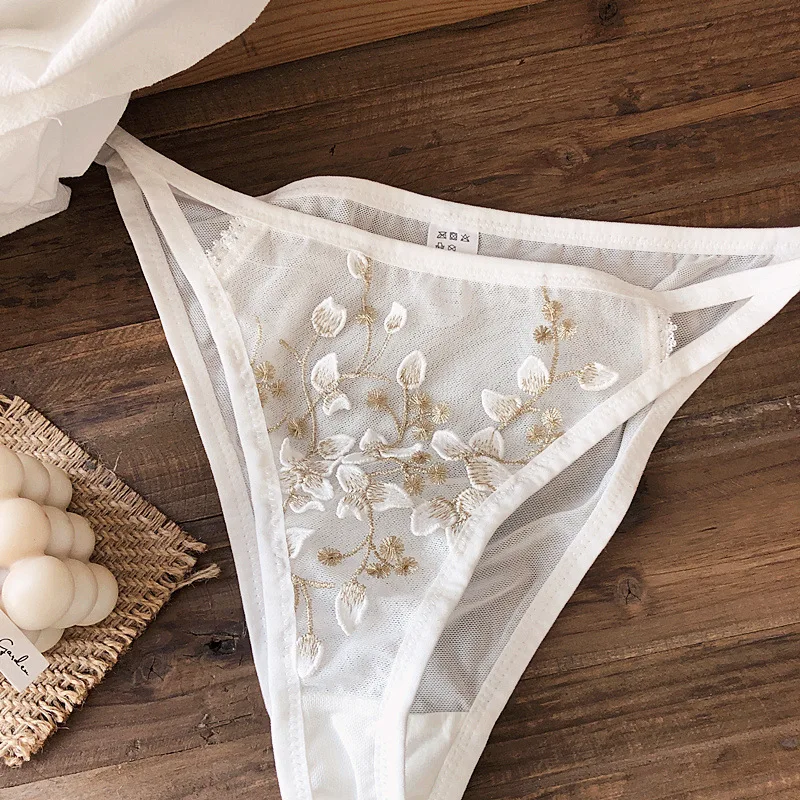 Majtki damskie o kroju stringów z przezroczystą, drobną siateczką na przednim panelu i bokach. Centralną część zdobi haft z motywami roślinnymi, takimi jak pnącza, gałązki i liście. Krawędzie wykończone są kryjącą lamówką, a krój cechuje się wysokim wycięciem na nogi.