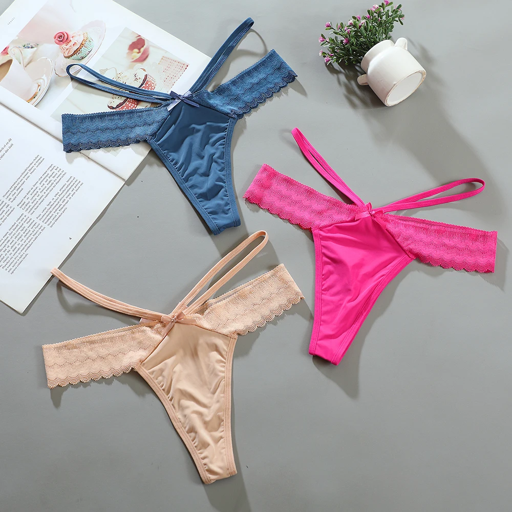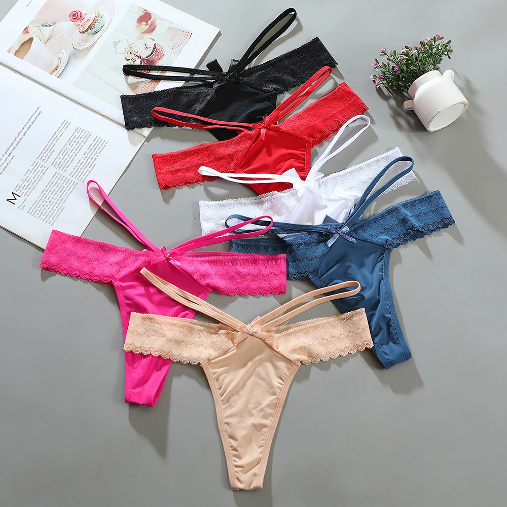 Krój typu stringi, Szeroka koronka z przodu, Ozdobna kokardka, Cienkie podwójne paski boczne, Minimalne zakrycie z tyłu, Falisty brzeg koronki