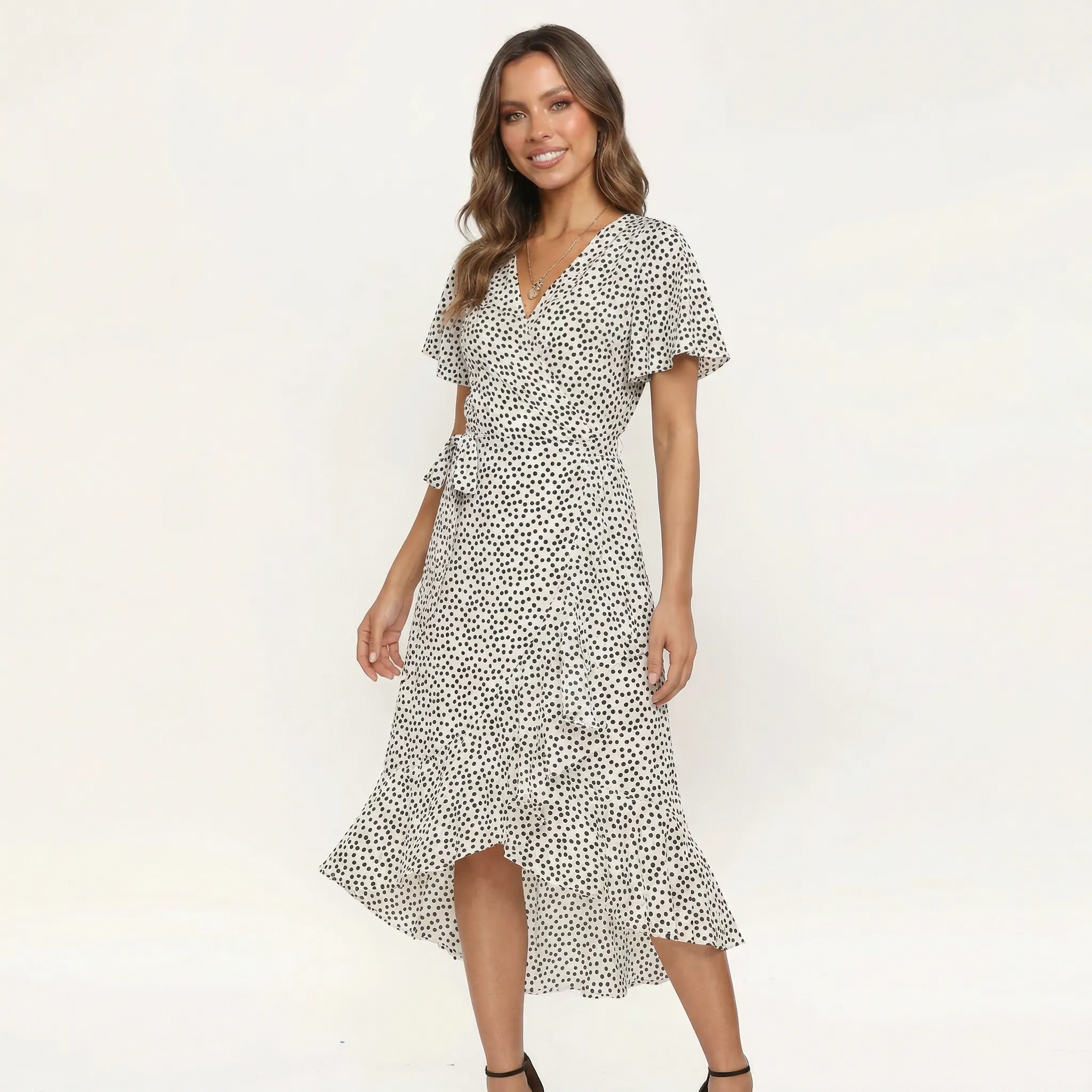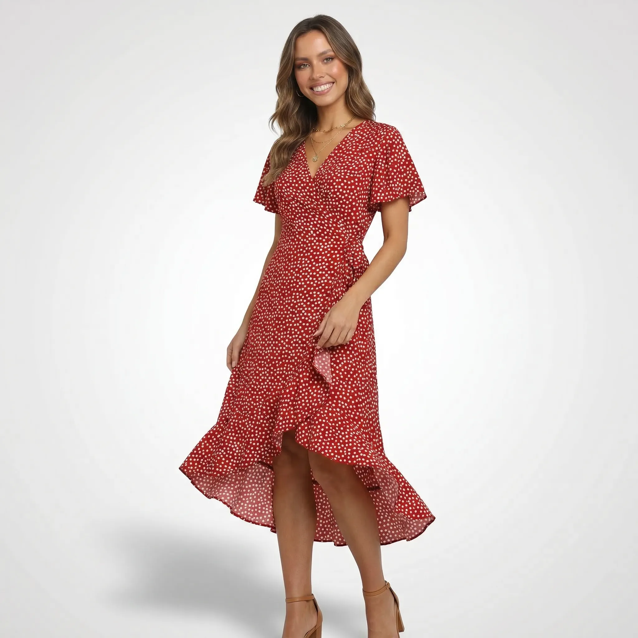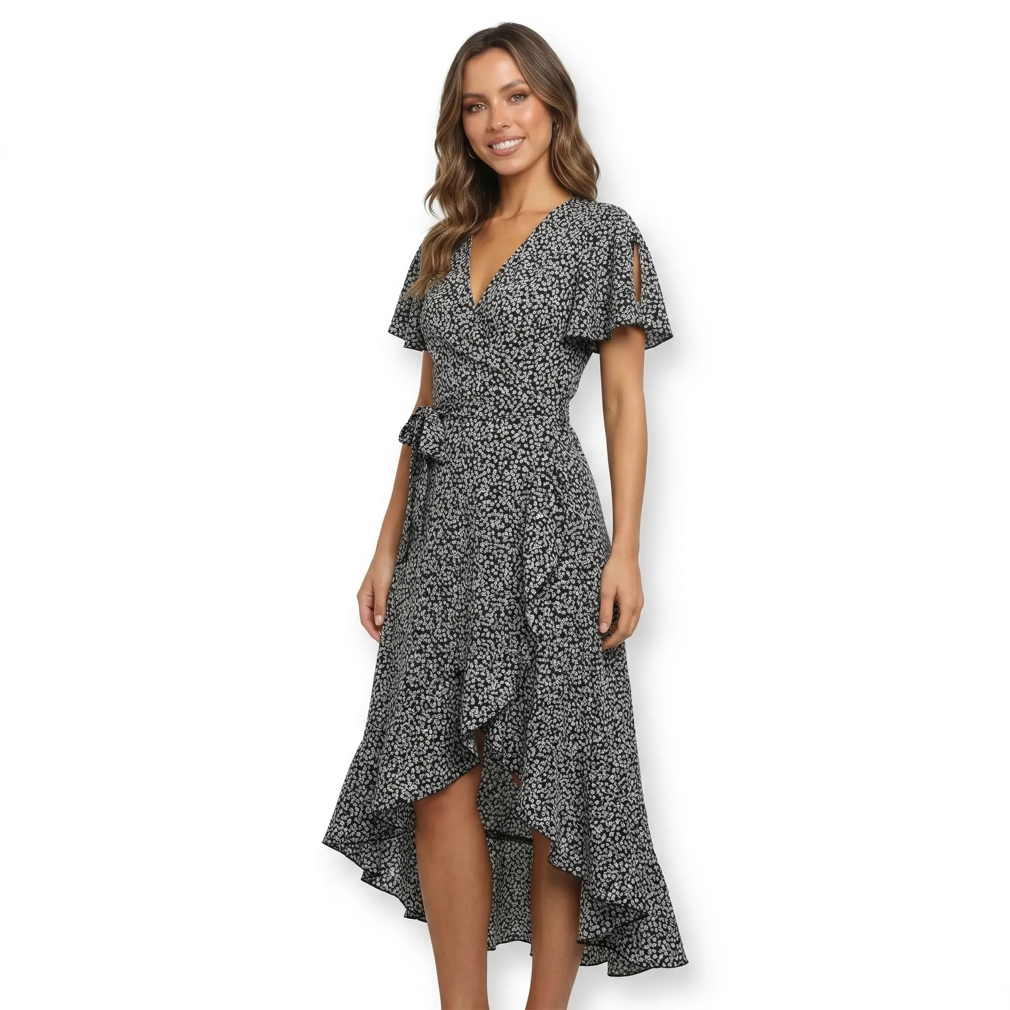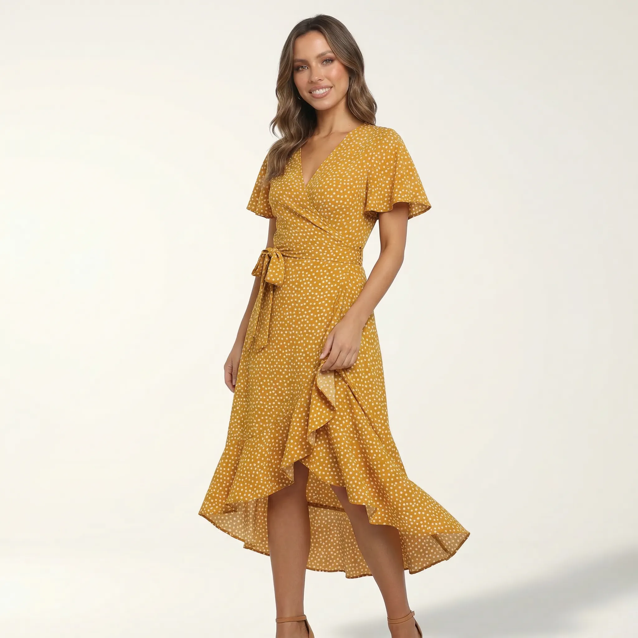 Dół sukienki wykończony jest falbanami ułożonymi asymetrycznie, co potęguje wrażenie lekkości i falowania materiału. Całość udekorowana drobnym, rozproszonym wzorem tworzy lekki, letni nastrój — świetnie komponuje się ze słomianą torebką i prostymi sandałami, podkreślając wakacyjny, kobiecy look.