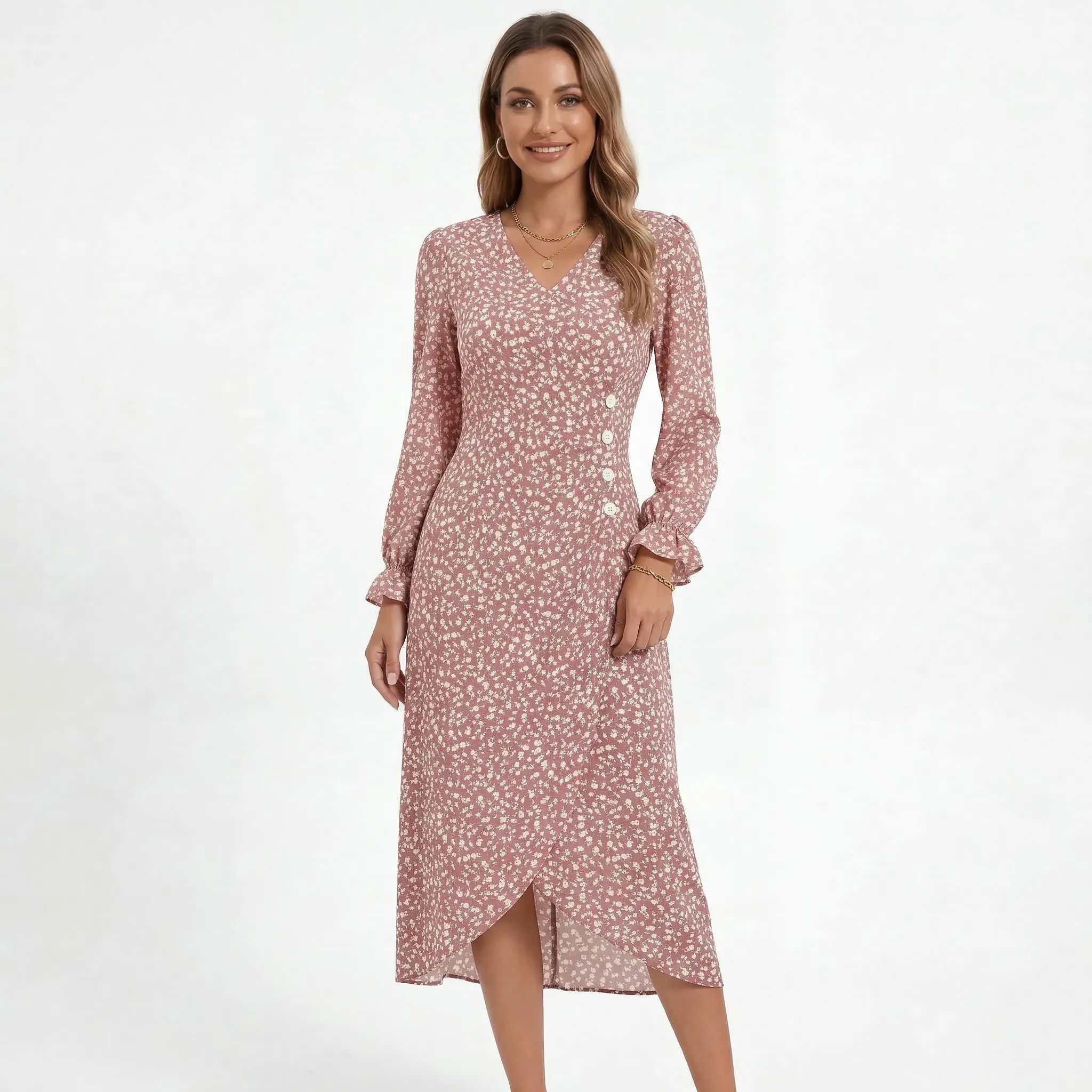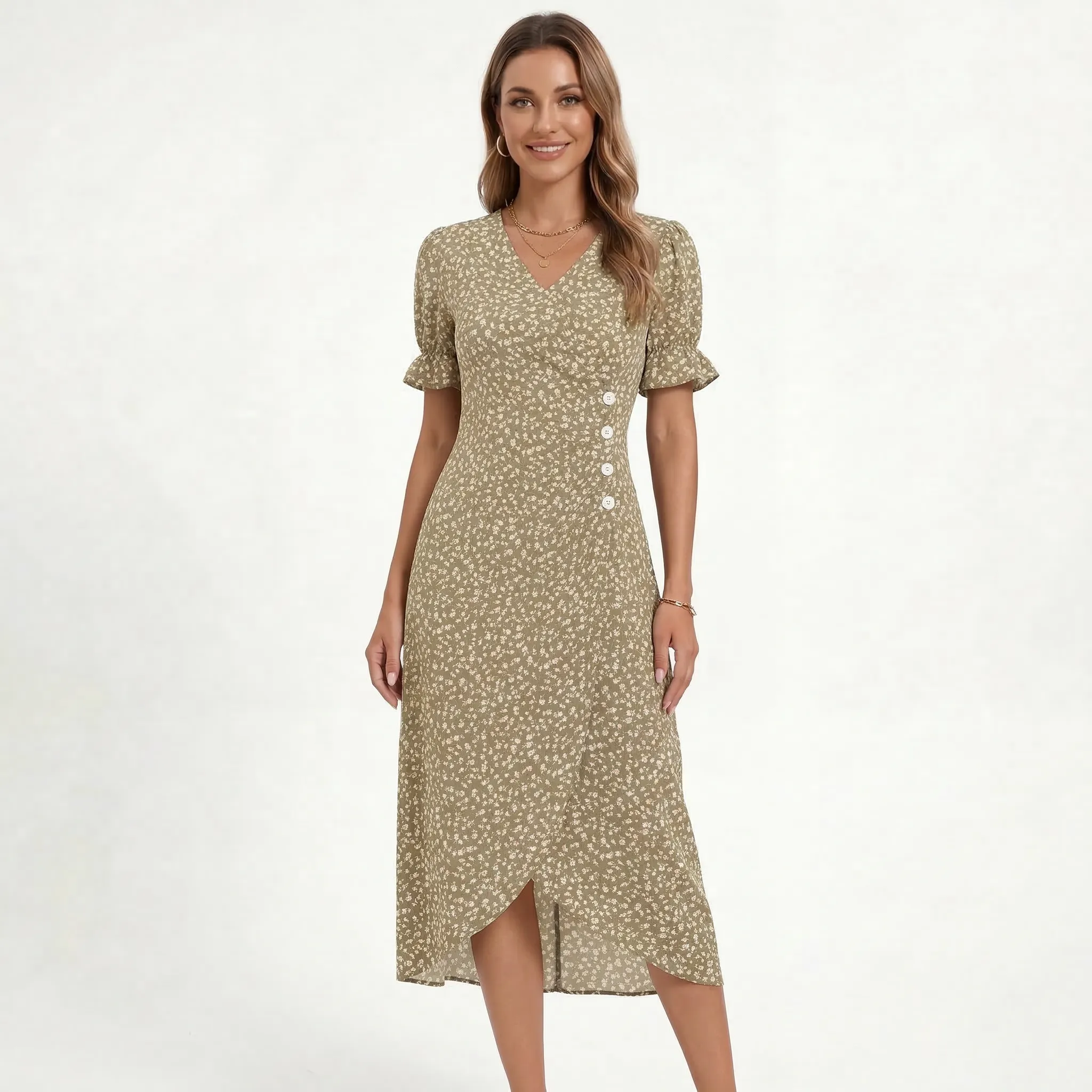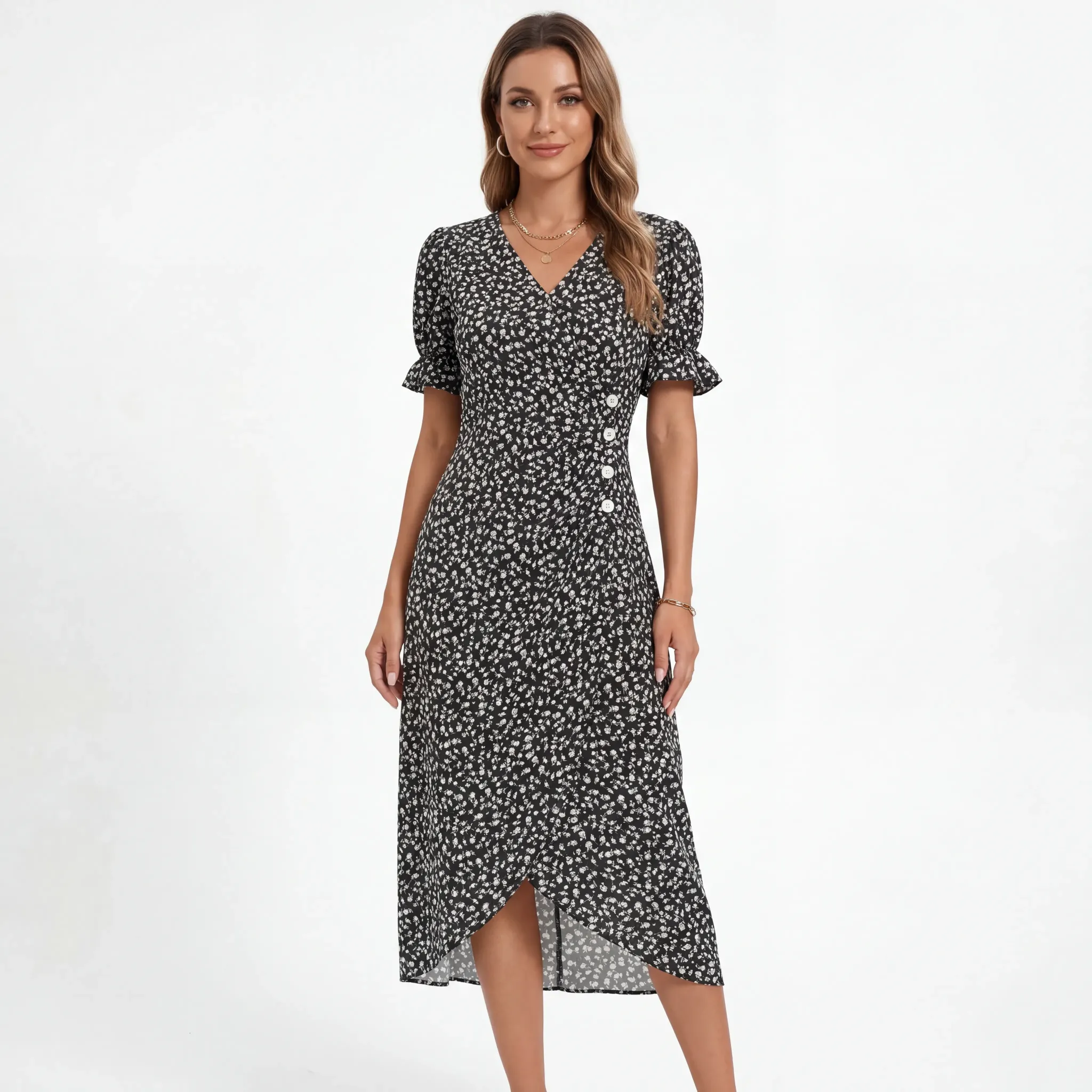 Sukienka kopertowa midi z falbankami i ozdobnymi guziczkami