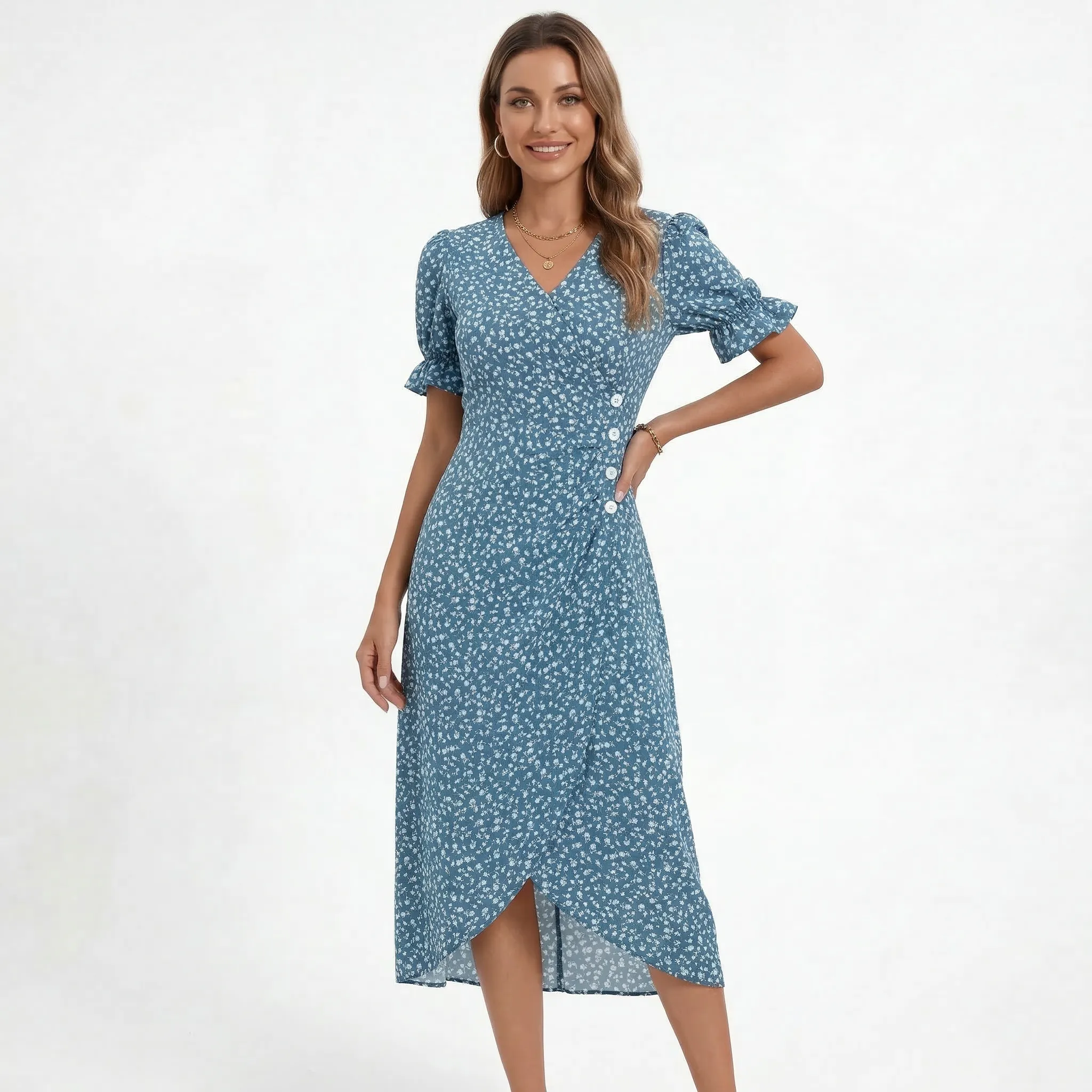 Napisz pierwszą opinię o „Sukienka kopertowa midi z falbankami i ozdobnymi guziczkami”