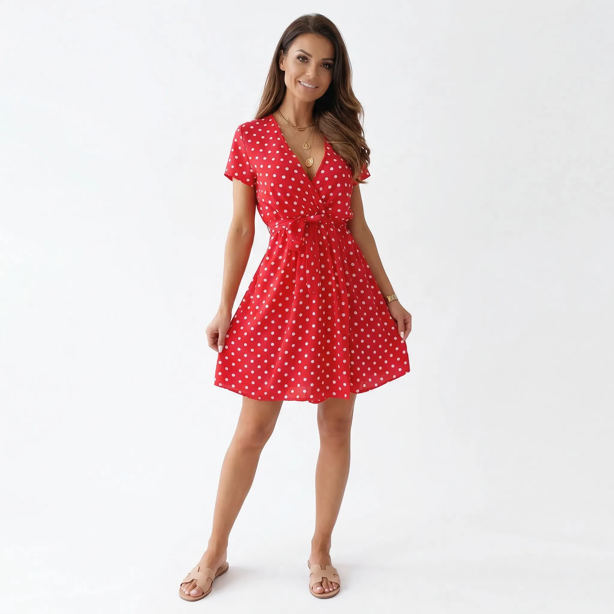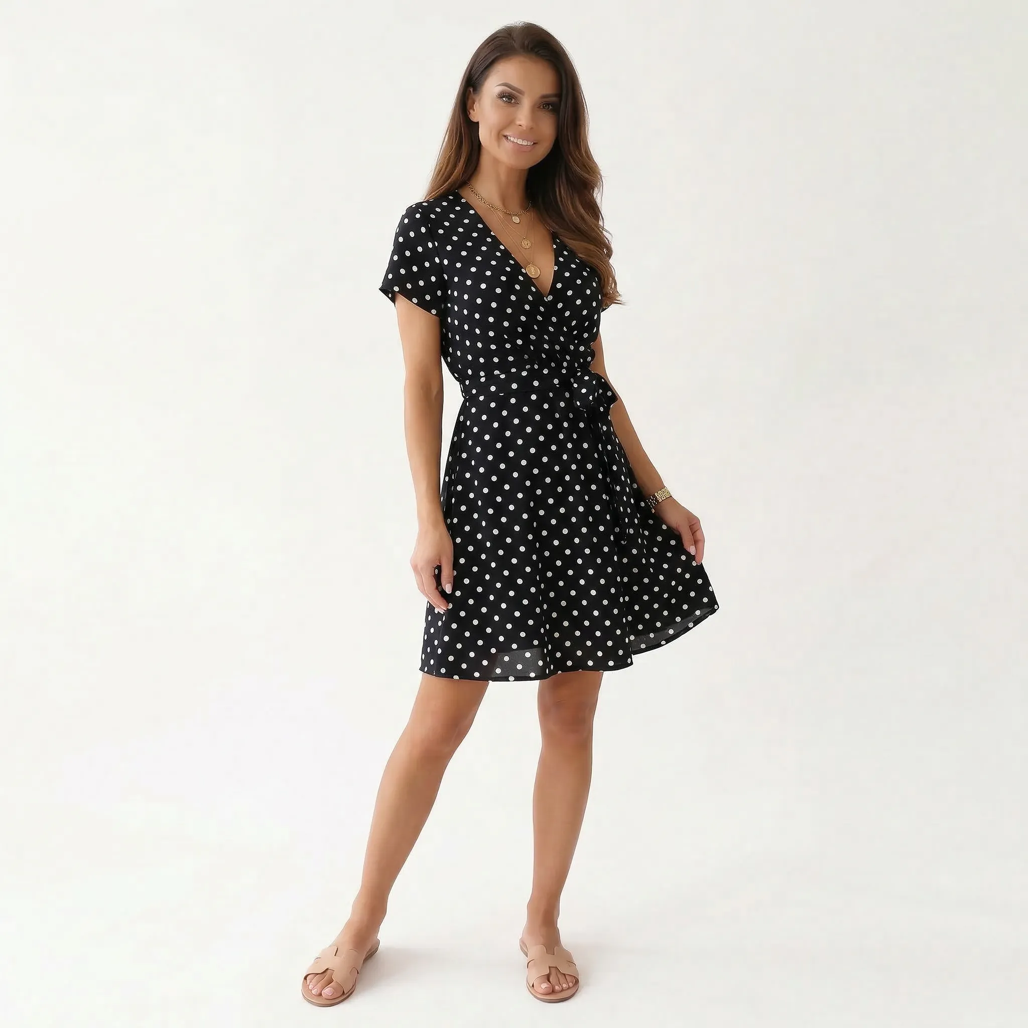 Sukienka kopertowa w groszki z wiązaniem w talii