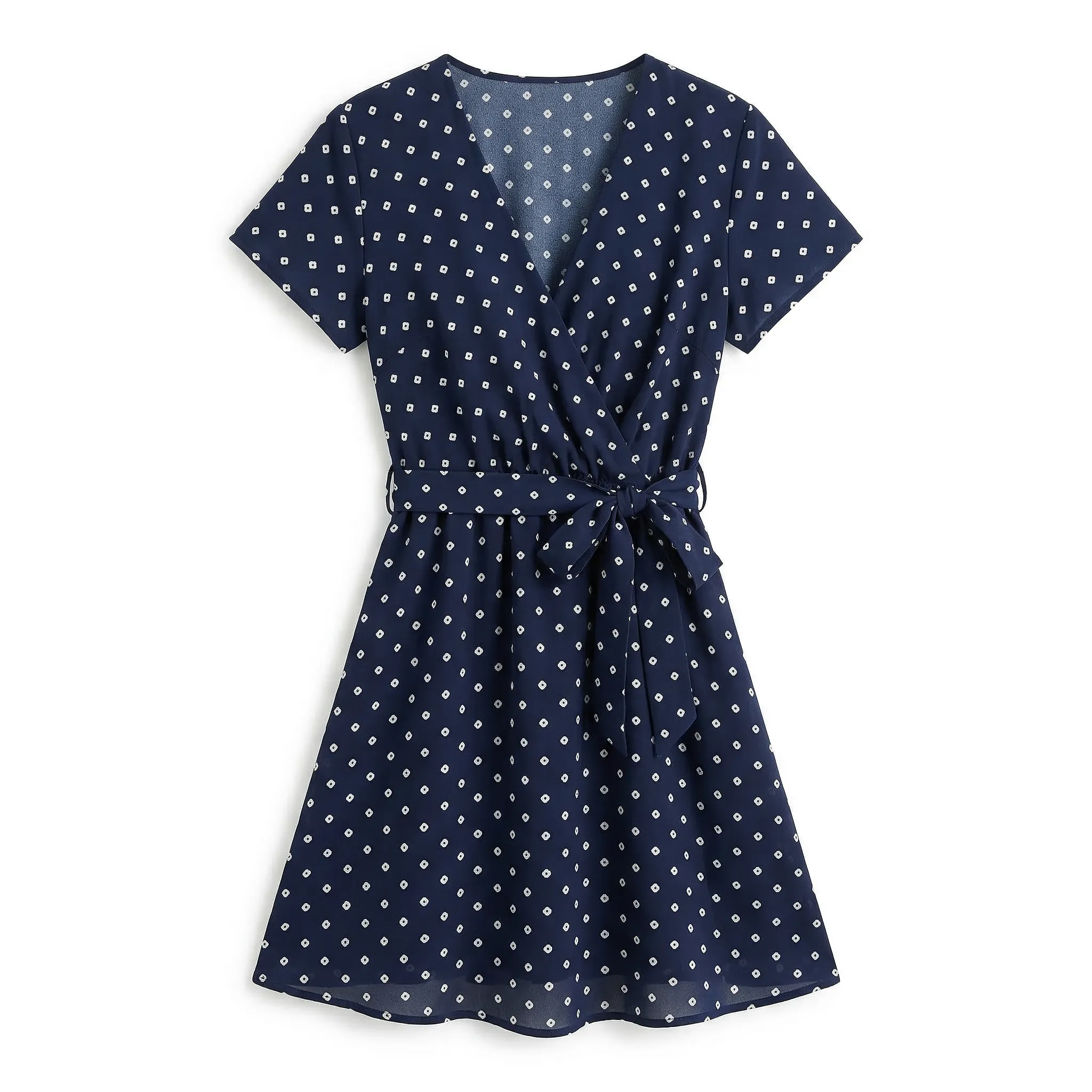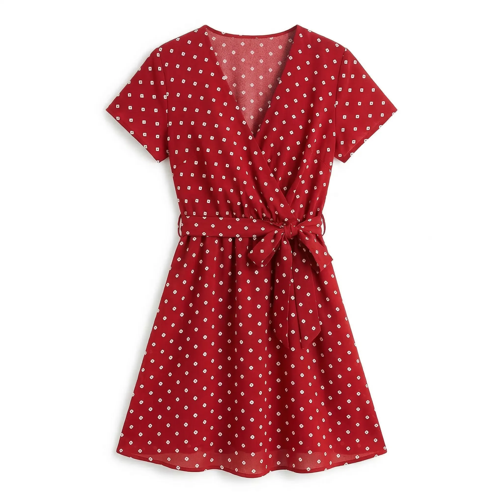 kopertowy krój, groszki, wiązanie w talii, krótkie rękawy, krótka długość, czarny, czerwony, niebieski, granatowy
