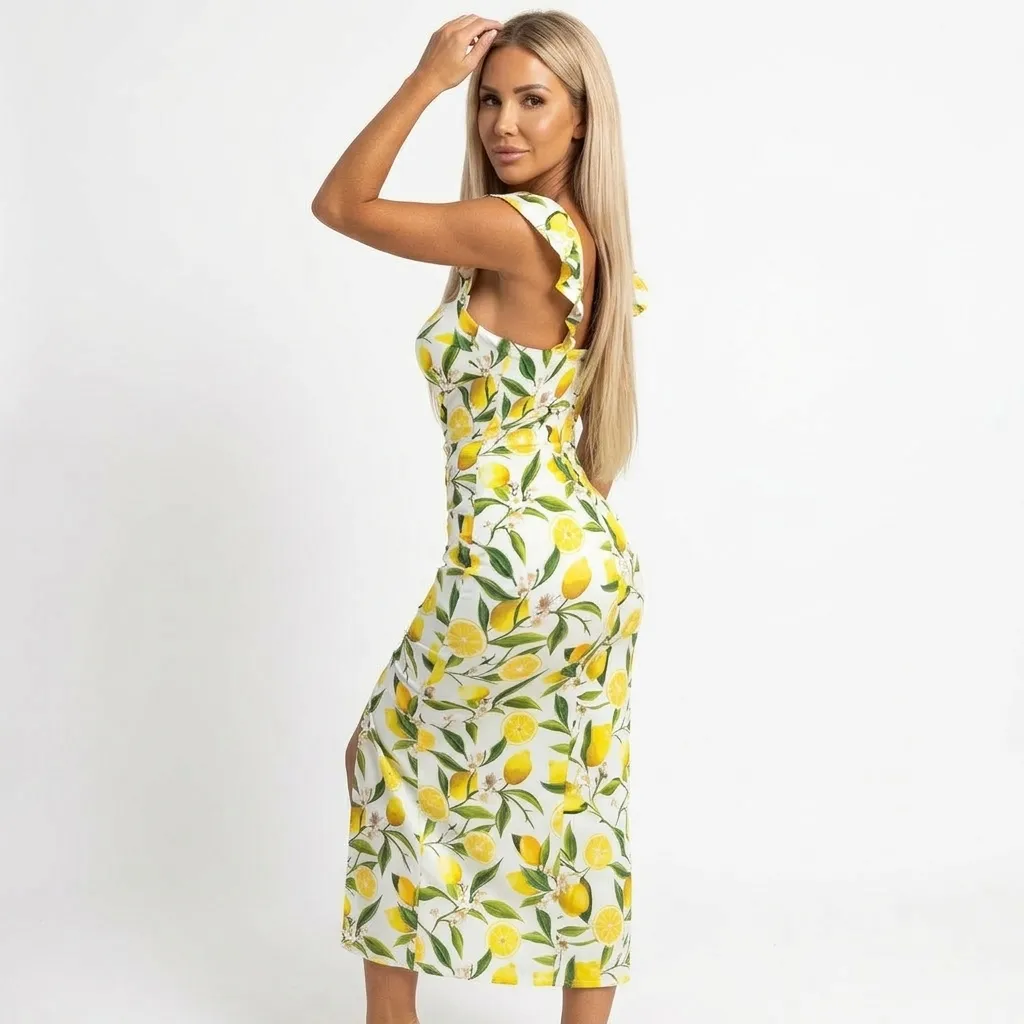 Spódnica o długości midi kończy się asymetrycznym rozcięciem na udzie, które wprowadza dynamikę i odsłania nogę przy każdym kroku. Całość ozdobiona jest botanicznym motywem cytrusów — plasterkami i całymi owocami otoczonymi drobnymi listkami i kwiatami — co nadaje projektowi świeżości i wakacyjnego charakteru. Subtelne marszczenia przy bocznych szwach oraz dopasowane cięcia tworzą ciekawą fakturę wizualną i podkreślają proporcje sylwetki.