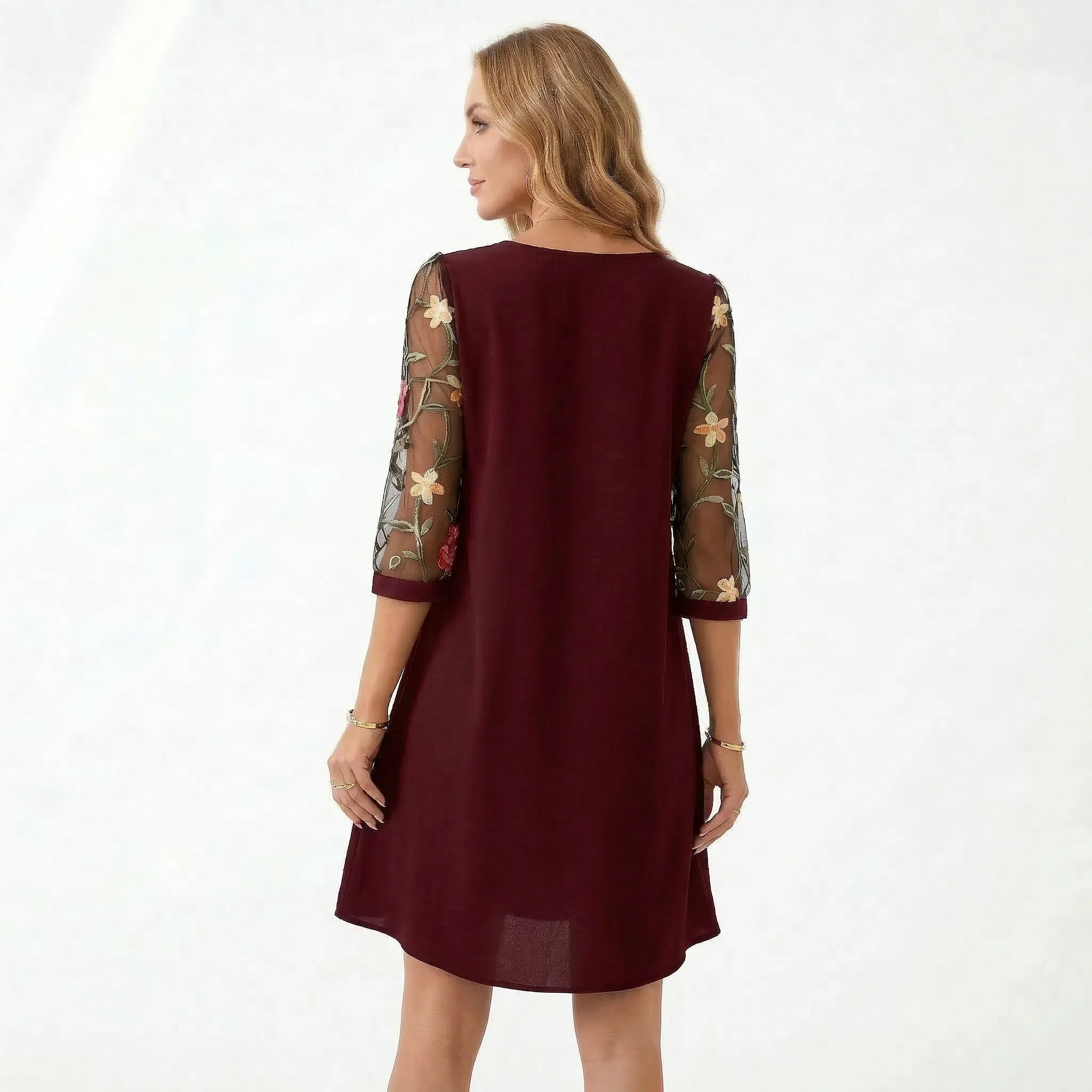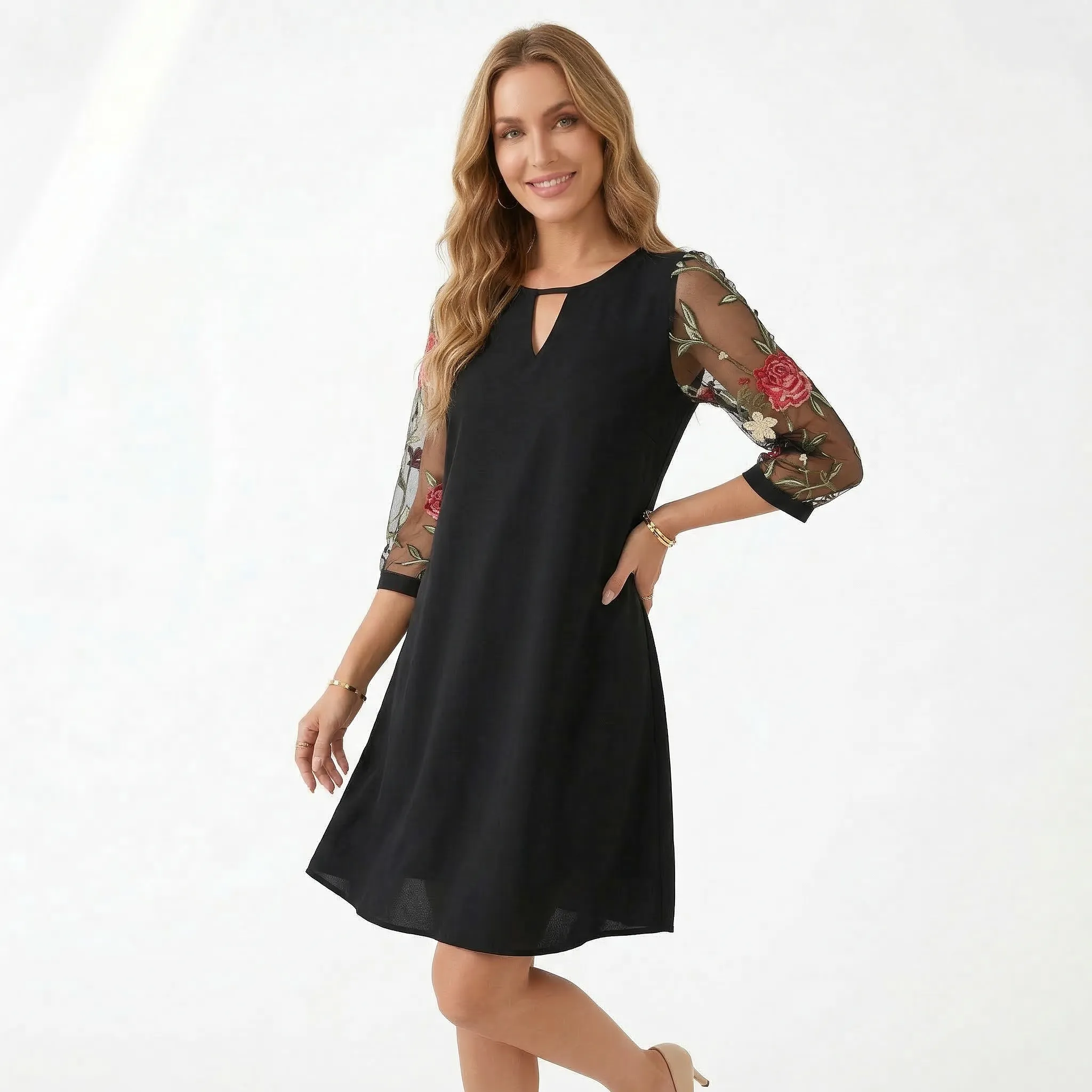 mini, przezroczyste haftowane rękawy, rękaw 3/4, wycięcie przy dekolcie, lekko rozkloszowany krój