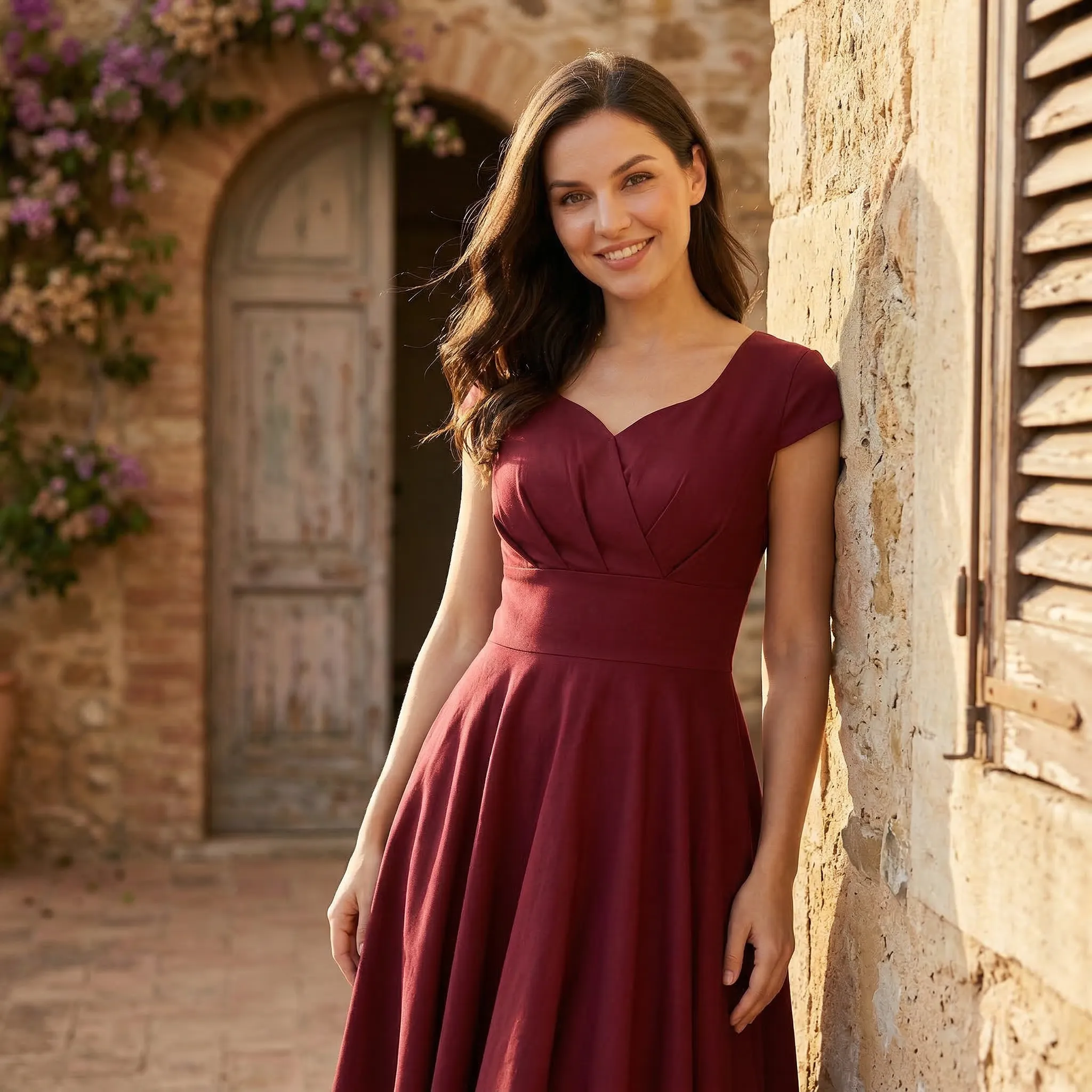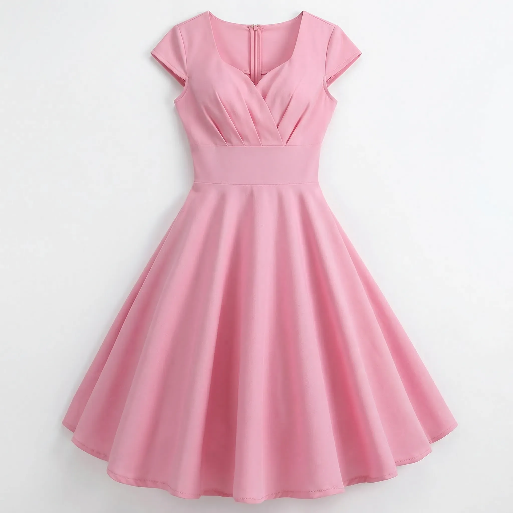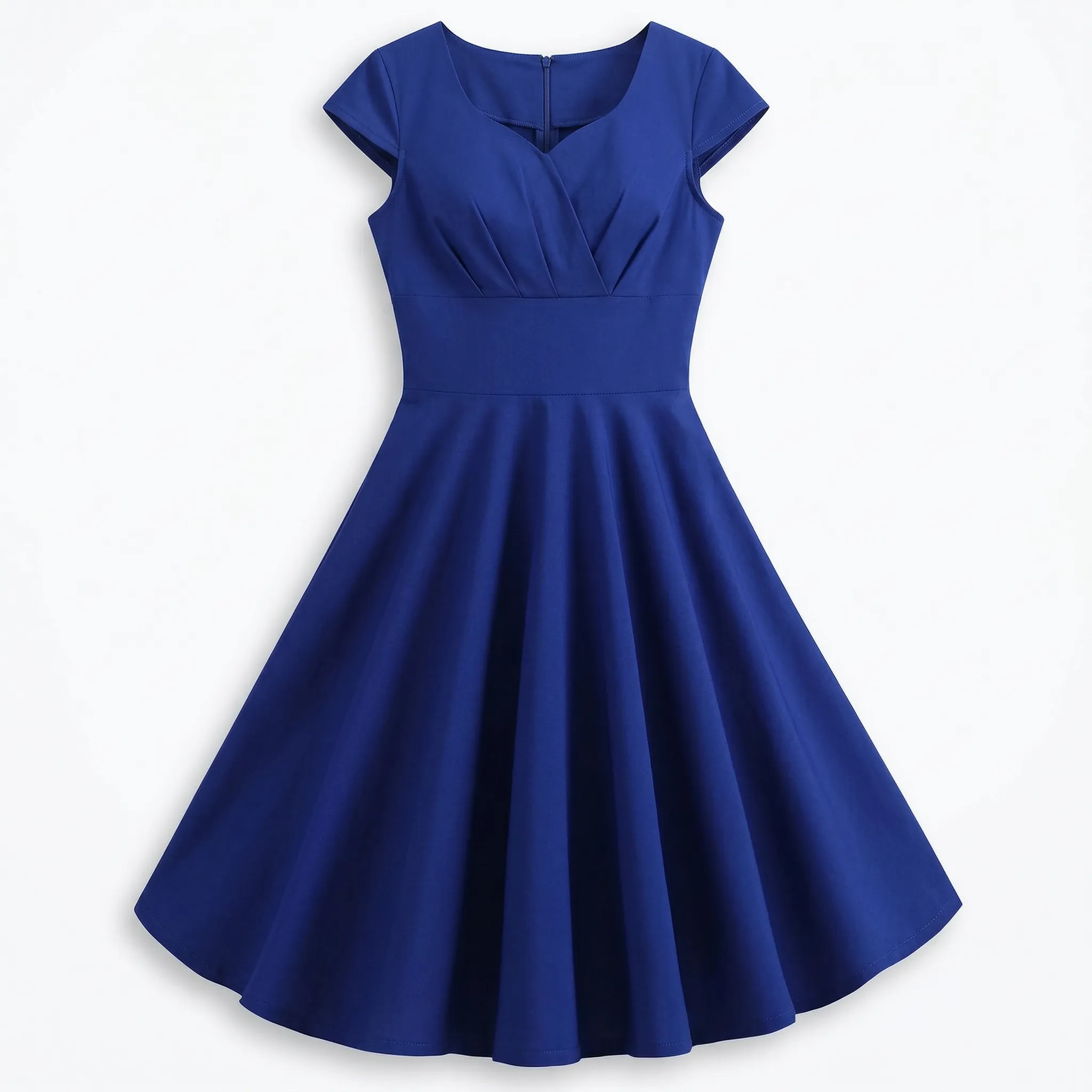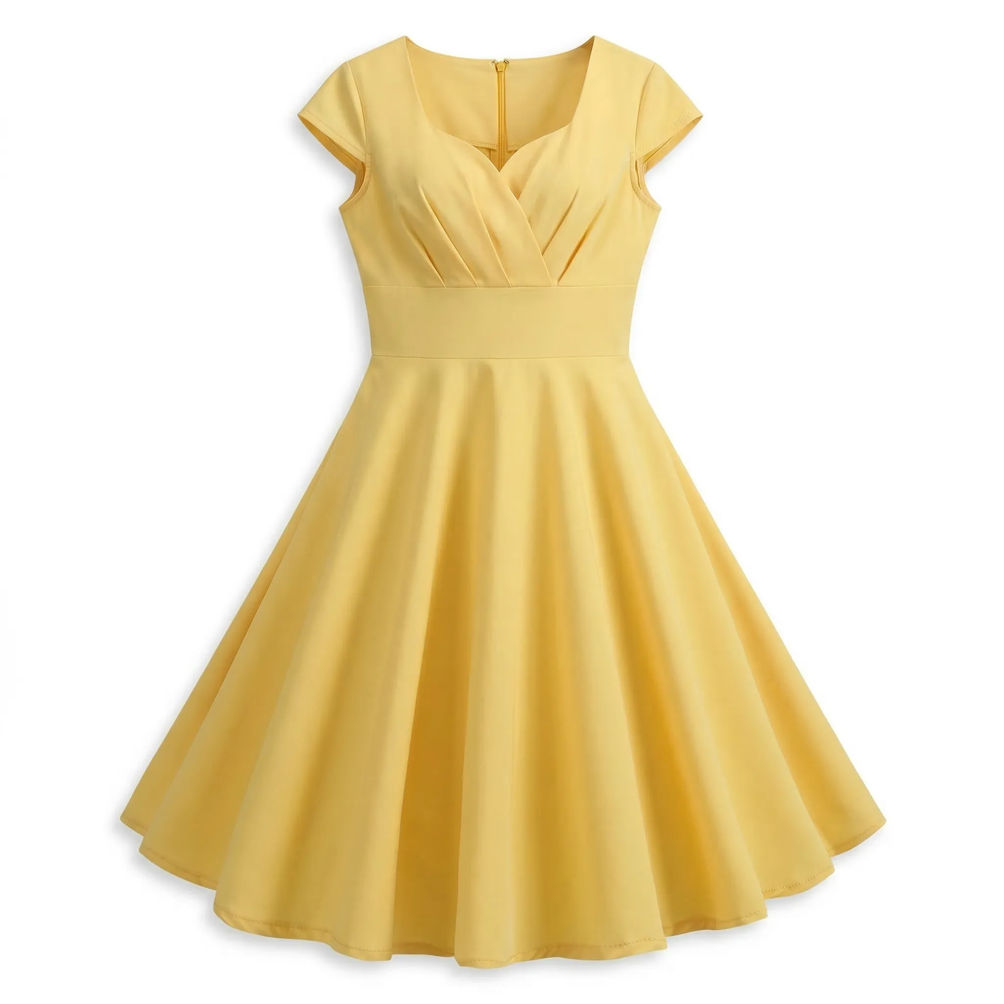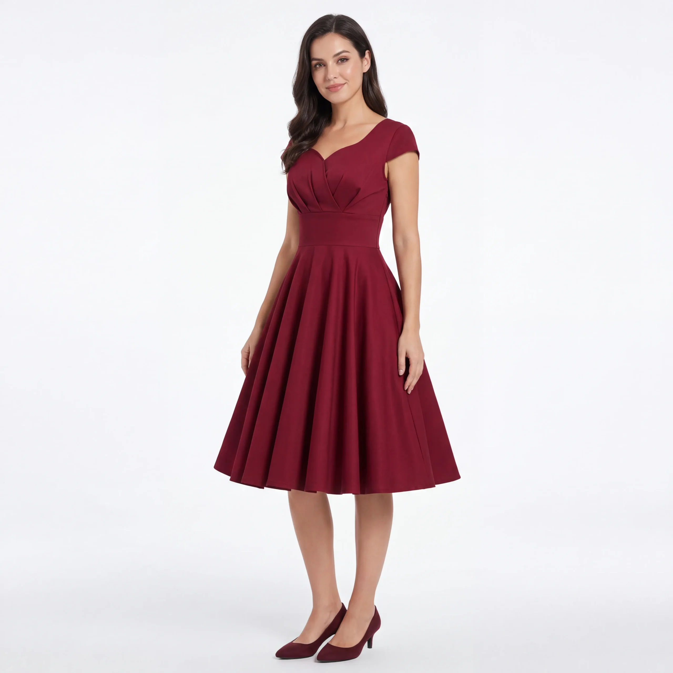 Kobieca sylwetka w stylu retro — talia podkreślona szerokim pasem płynnie przechodzi w obszerny, rozkloszowany dół o pełnej, okrągłej linii. Krótsze, delikatnie zaokrąglone rękawki i zaokrąglony dekolt tworzą klasyczną, elegancką ramę, która subtelnie odsłania górę sylwetki.