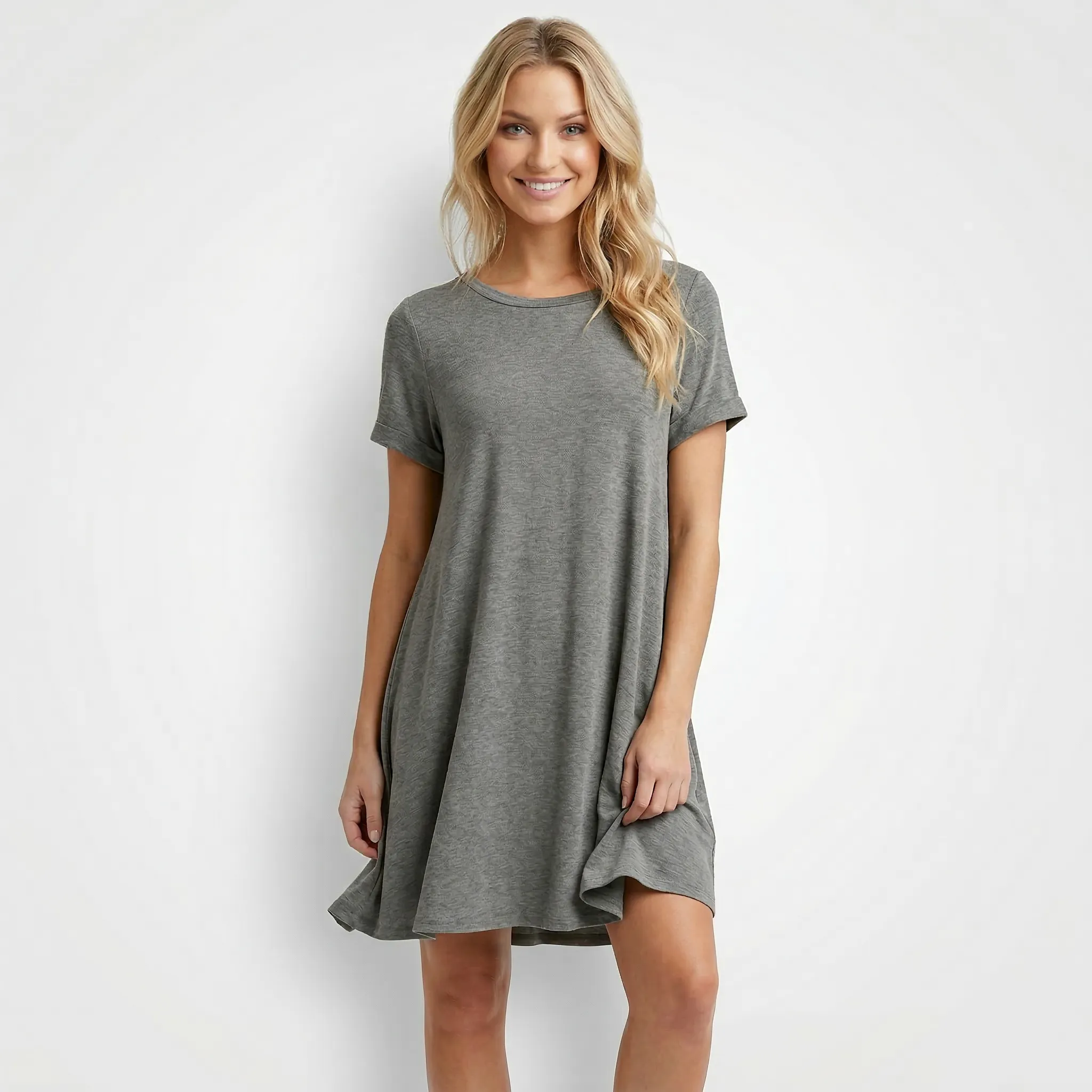 Rozkloszowany dół sięga nad kolano, ukazując miękkie fałdy i naturalny sposób układania tkaniny. Brak wyraźnego zaznaczenia talii potęguje minimalistyczny charakter, a prosty, lekko zaokrąglony brzeg sukienki dopełnia stonowaną kompozycję.